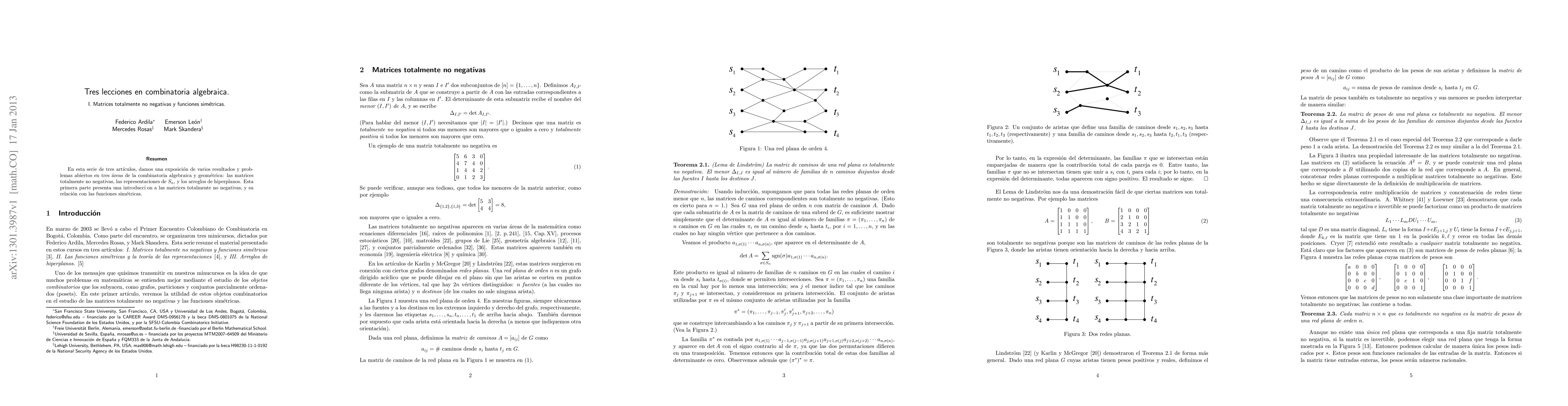 En esta serie de tres articulos, damos una exposicion de varios resultados y problemas abiertos en tres areas de la combinatoria algebraica y geometrica: las matrices totalmente no negativas, las representaciones del grupo simetrico, y los arreglos de hiperplanos. Esta primera parte presenta una introduccion a las matrices totalmente no negativas, y su relacion con las funciones simetricas. In this series of three articles, we give an exposition of various results and open problems in three areas of algebraic and geometric combinatorics: totally non-negative matrices, representations of the symmetric group, and hyperplane arrangements. This first part presents an introduction to totally non-negative matrices and their relationship with symmetric functions.