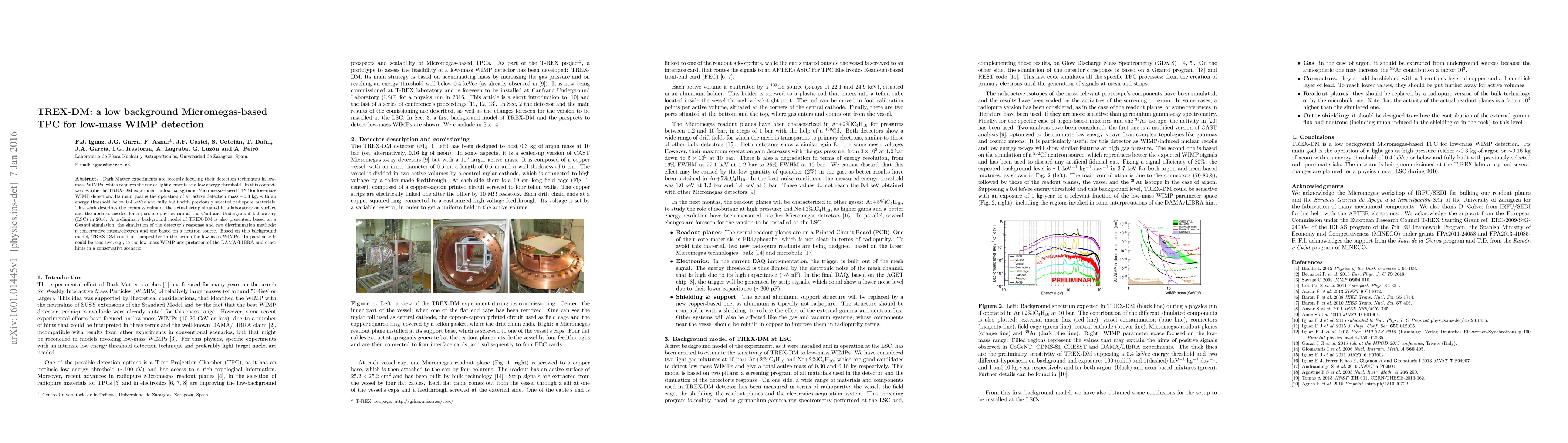 The TREX-DM experiment employs a low background Micromegas-based Time Projection Chamber (TPC) to detect low-mass Weakly Interacting Massive Particles (WIMPs) with an energy threshold below 0.4 keVee. The setup aims for a competitive search for low-mass WIMPs, potentially confirming the DAMA/LIBRA results, based on a preliminary background model and discrimination methods.