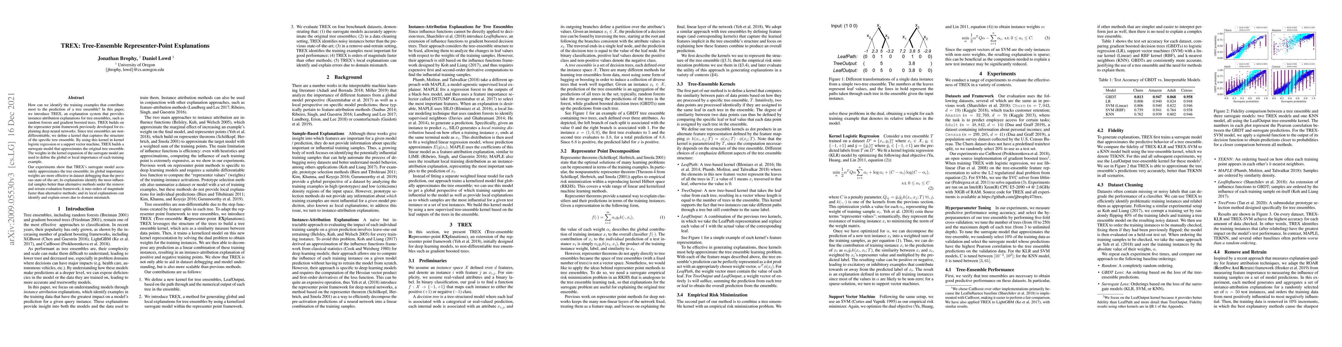 TREX provides instance-attribution explanations for tree ensembles by approximating them with a surrogate model based on kernel logistic regression. It identifies the most influential training examples, runs significantly faster than alternatives, and effectively identifies errors due to domain mismatch.