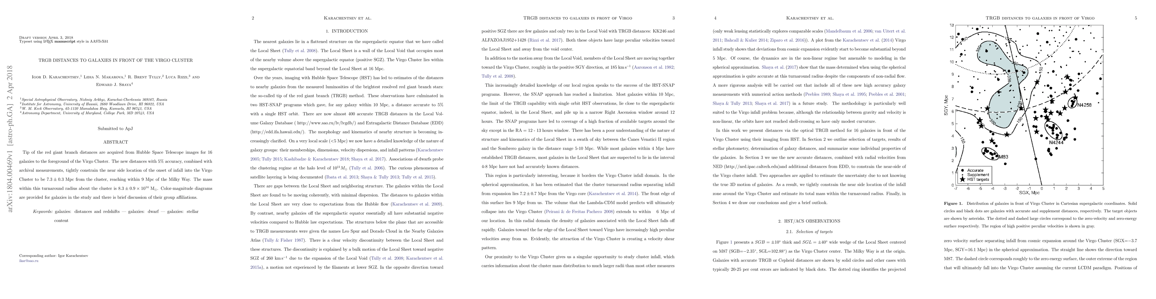 This paper uses Tip of the Red Giant Branch distances from Hubble Space Telescope images to determine the near side infall onset into the Virgo Cluster at 7.3±0.3 Mpc, with a mass of 8.3±0.9 x 10^14 Msun within this radius, and discusses the group affiliations of the studied galaxies.