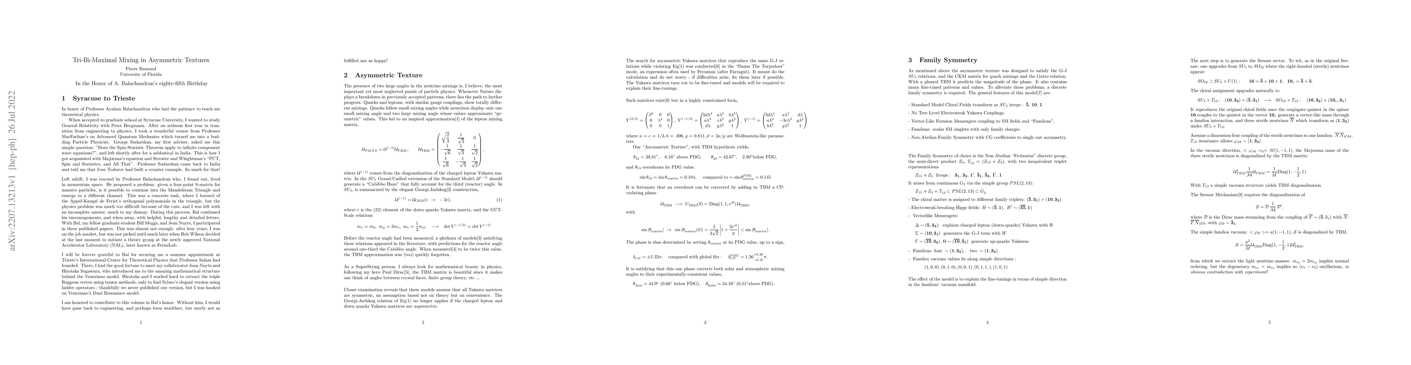 At the occasion of his eighty fifth birthday, I wish to to recognize the crucial role that my advisor, Professor Ayalam Balachandran, played in enabling me to evolve from engineering to physics. So many years later, this student presents his latest efforts: the importance of asymmetry in the Yukawa matrices. We start with a purely phenomenological approach with Tri-Bi-Maximal mixing as input: it predicts the value of the CP-violating angle with the three mixing angles within one sigma of their pdf values. To ensure as much naturalness as possible, a model which starts from $SU_5$ and extends to $E_6$ is discussed, in the context of finite family groups which are subgroups $G_2$.