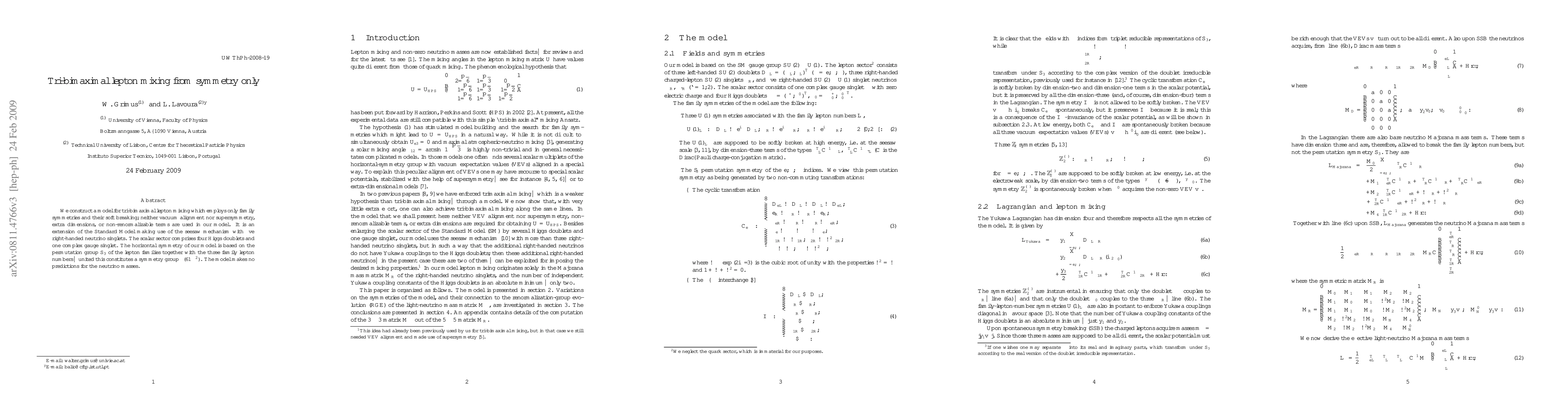 This paper proposes a model for tri-bimaximal lepton mixing using only family symmetries and their soft breaking, without relying on vacuum alignment, supersymmetry, or extra dimensions. The model extends the Standard Model with the seesaw mechanism and five right-handed neutrinos, employing a symmetry group Delta(6∞²) based on S_3 and lepton numbers.