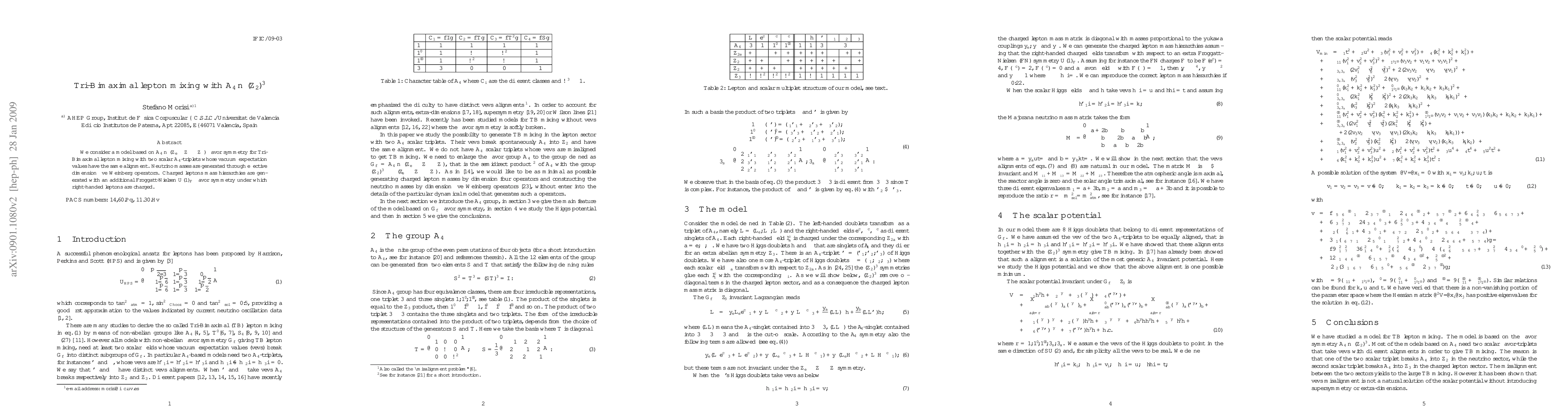We consider a model based on A4 semidirect product (Ze x Zmu x Ztau) flavor symmetry for Tri-Bimaximal lepton mixing with two scalar A4-triplets whose vacuum expectation values have the same alignment. Neutrino masses are generated through effective dimension five Weinberg operators. Charged leptons mass hierarchies are generated with an additional Froggatt-Nielsen U(1) flavor symmetry under which right-handed leptons are charged.