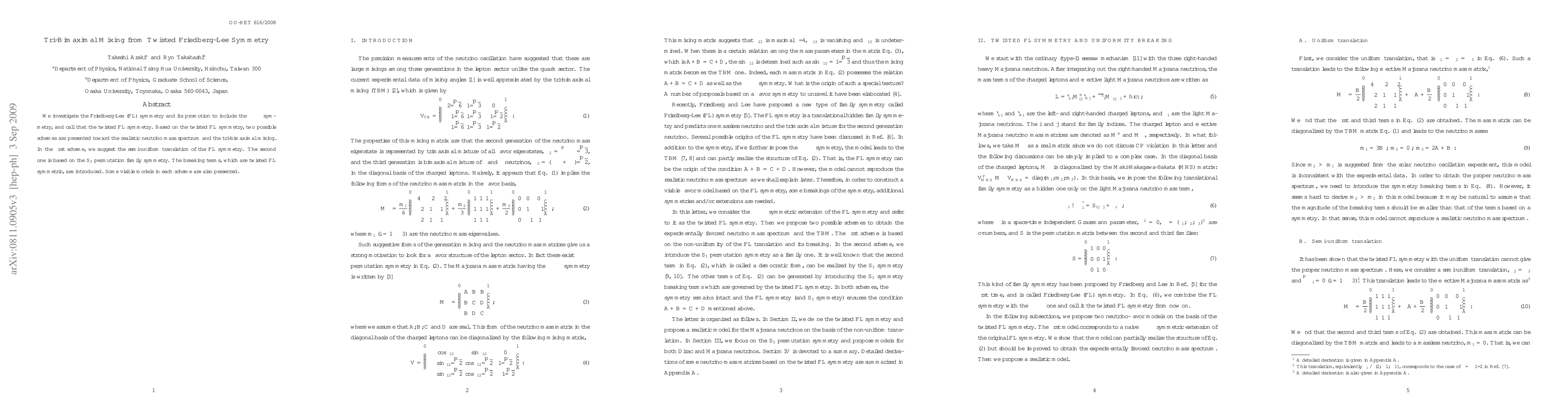 We investigate the Friedberg-Lee (FL) symmetry and its promotion to include the $\mu - \tau$ symmetry, and call that the twisted FL symmetry.Based on the twisted FL symmetry, two possible schemes are presented toward the realistic neutrino mass spectrum and the tri-bimaximal mixing.In the first scheme, we suggest the semi-uniform translation of the FL symmetry.The second one is based on the $S_3$ permutation family symmetry.The breaking terms, which are twisted FL symmetric, are introduced.Some viable models in each scheme are also presented.
