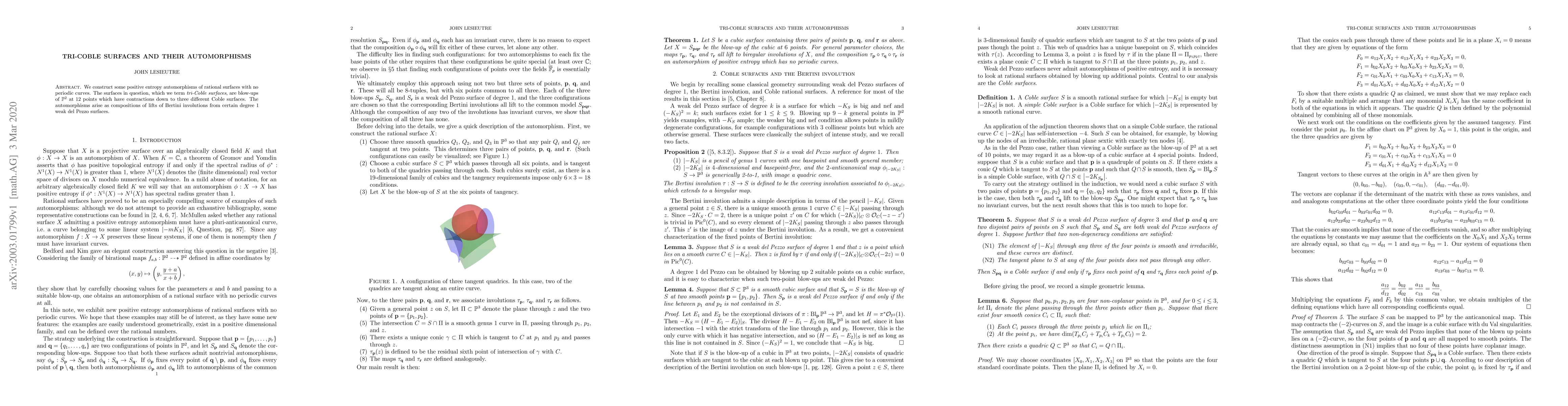 This paper constructs positive entropy automorphisms for tri-Coble surfaces, which are rational surfaces formed by blowing up the projective plane at 12 points, with contractions leading to three distinct Coble surfaces. The automorphisms are derived from compositions of lifts of Bertini involutions from specific degree 1 weak del Pezzo surfaces.