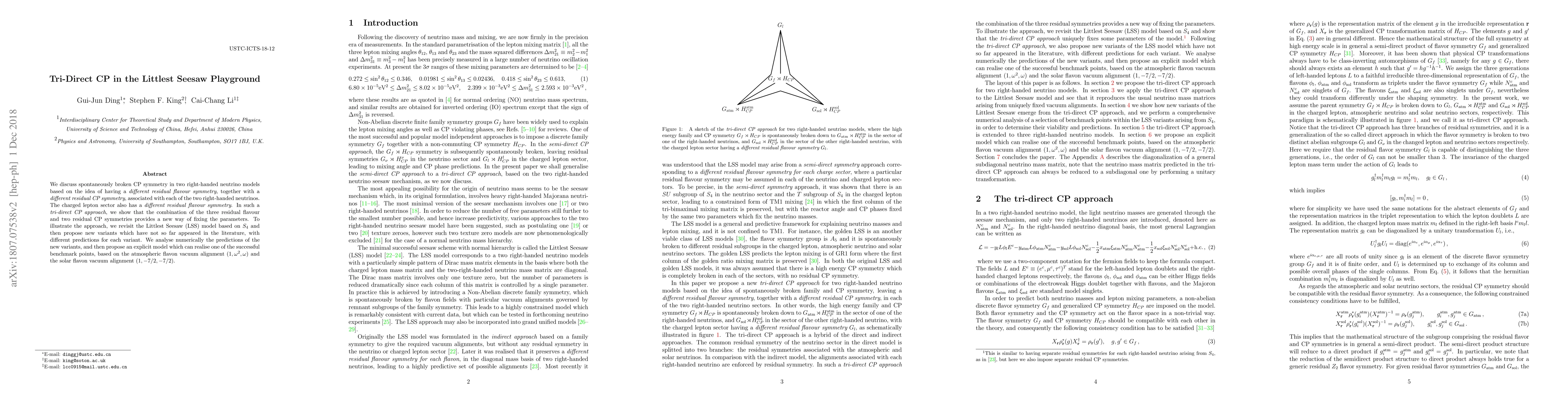 We discuss spontaneously broken CP symmetry in two right-handed neutrino models based on the idea of having a {\it different residual flavour symmetry}, together with a {\it different residual CP symmetry}, associated with each of the two right-handed neutrinos. The charged lepton sector also has a {\it different residual flavour symmetry}. In such a {\it tri-direct CP approach}, we show that the combination of the three residual flavour and two residual CP symmetries provides a new way of fixing the parameters. To illustrate the approach, we revisit the Littlest Seesaw (LSS) model based on $S_4$ and then propose new variants which have not so far appeared in the literature, with different predictions for each variant. We analyse numerically the predictions of the new variants, and then propose an explicit model which can realise one of the successful benchmark points, based on the atmospheric flavon vacuum alignment $(1, \omega^2 , \omega)$ and the solar flavon vacuum alignment $(1, -7/2, -7/2 )$.