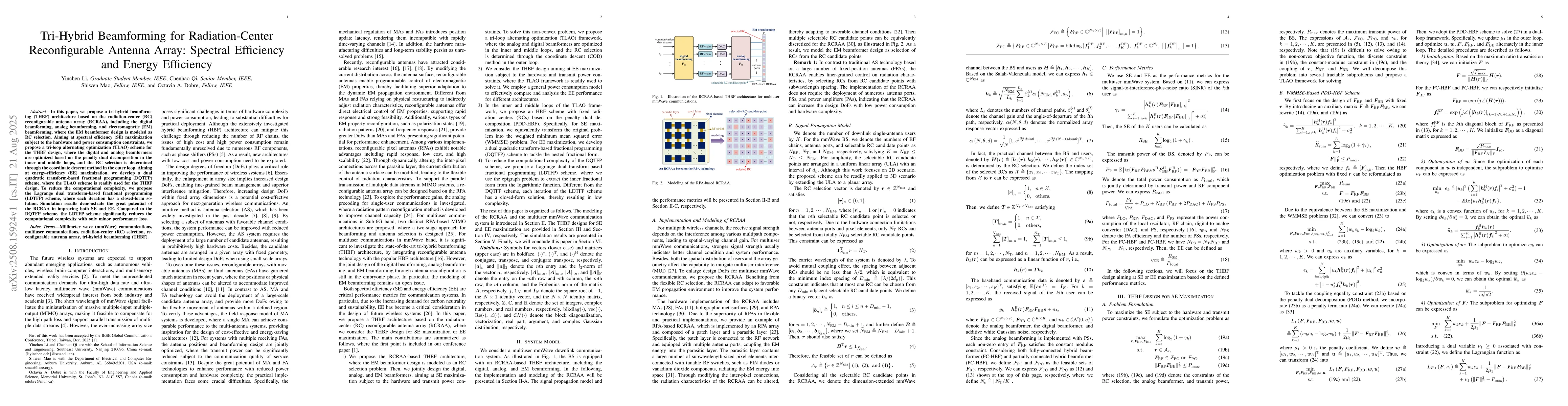 In this paper, we propose a tri-hybrid beamforming (THBF) architecture based on the radiation-center (RC) reconfigurable antenna array (RCRAA), including the digital beamforming, analog beamforming, and electromagnetic (EM) beamforming, where the EM beamformer design is modeled as RC selection. Aiming at spectral efficiency (SE) maximization subject to the hardware and power consumption constraints, we propose a tri-loop alternating optimization (TLAO) scheme for the THBF design, where the digital and analog beamformers are optimized based on the penalty dual decomposition in the inner and middle loops, and the RC selection is determined through the coordinate descent method in the outer loop. Aiming at energy-efficiency (EE) maximization, we develop a dual quadratic transform-based fractional programming (DQTFP) scheme, where the TLAO scheme is readily used for the THBF design. To reduce the computational complexity, we propose the Lagrange dual transform-based fractional programming (LDTFP) scheme, where each iteration has a closed-form solution. Simulation results demonstrate the great potential of the RCRAA in improving both SE and EE. Compared to the DQTFP scheme, the LDTFP scheme significantly reduces the computational complexity with only minor performance loss.