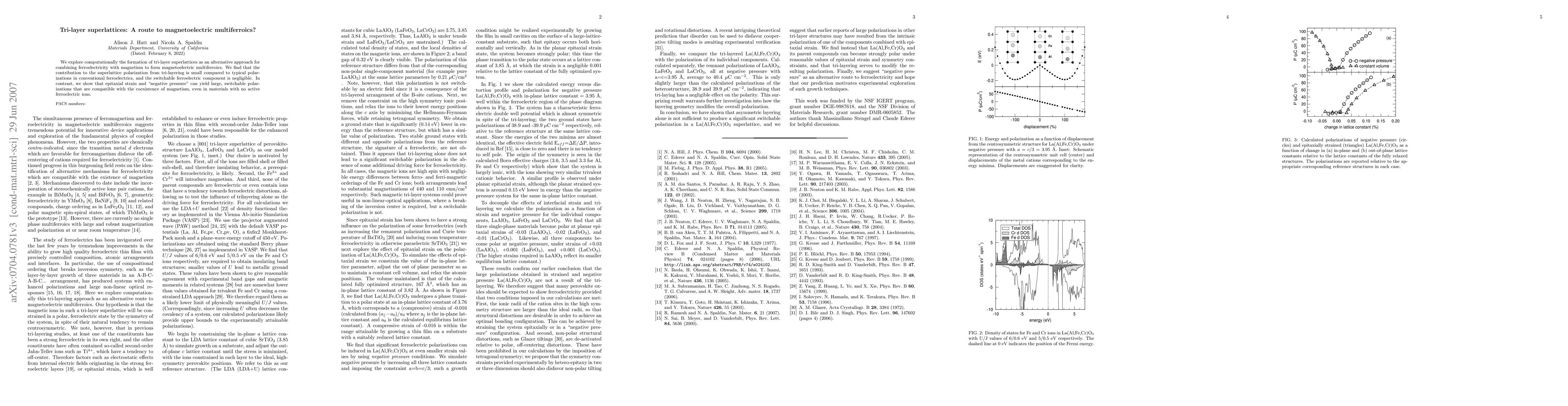 We explore computationally the formation of tri-layer superlattices as an alternative approach for combining ferroelectricity with magnetism to form magnetoelectric multiferroics. We find that the contribution to the superlattice polarization from tri-layering is small compared to typical polarizations in conventionalferroelectrics, and the switchable ferroelectric component is negligible. In contrast, we show that epitaxial strain and ``negative pressure'' can yield large, switchable polarizations that are compatible with the coexistence of magnetism, even in materials with no active ferroelectric ions.