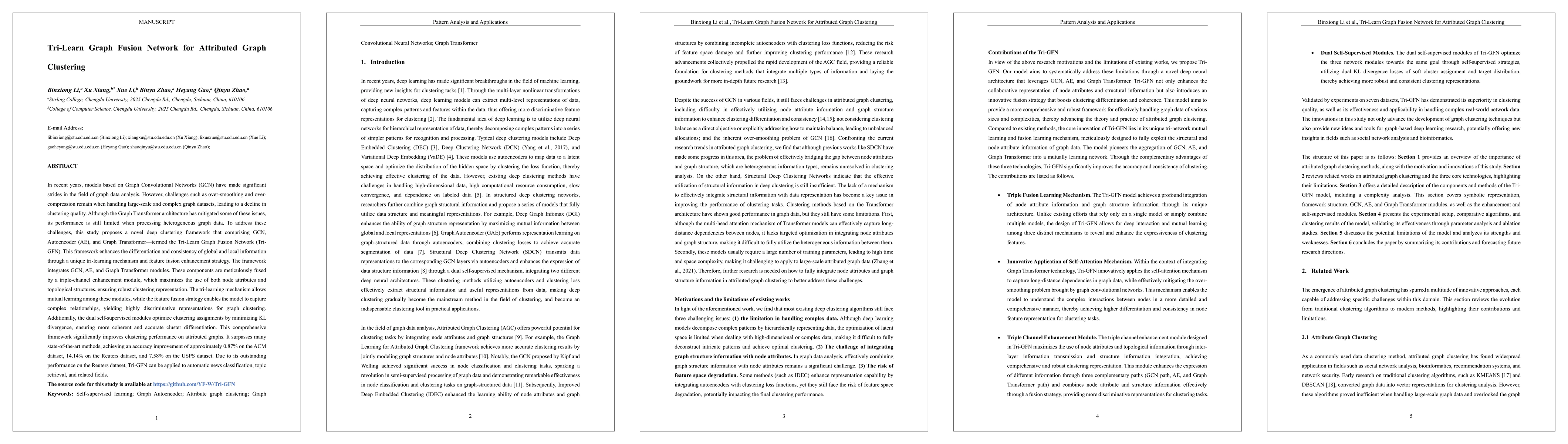 In recent years, models based on Graph Convolutional Networks (GCN) have made significant strides in the field of graph data analysis. However, challenges such as over-smoothing and over-compression remain when handling large-scale and complex graph datasets, leading to a decline in clustering quality. Although the Graph Transformer architecture has mitigated some of these issues, its performance is still limited when processing heterogeneous graph data. To address these challenges, this study proposes a novel deep clustering framework that comprising GCN, Autoencoder (AE), and Graph Transformer, termed the Tri-Learn Graph Fusion Network (Tri-GFN). This framework enhances the differentiation and consistency of global and local information through a unique tri-learning mechanism and feature fusion enhancement strategy. The framework integrates GCN, AE, and Graph Transformer modules. These components are meticulously fused by a triple-channel enhancement module, which maximizes the use of both node attributes and topological structures, ensuring robust clustering representation. The tri-learning mechanism allows mutual learning among these modules, while the feature fusion strategy enables the model to capture complex relationships, yielding highly discriminative representations for graph clustering. It surpasses many state-of-the-art methods, achieving an accuracy improvement of approximately 0.87% on the ACM dataset, 14.14 % on the Reuters dataset, and 7.58 % on the USPS dataset. Due to its outstanding performance on the Reuters dataset, Tri-GFN can be applied to automatic news classification, topic retrieval, and related fields.
