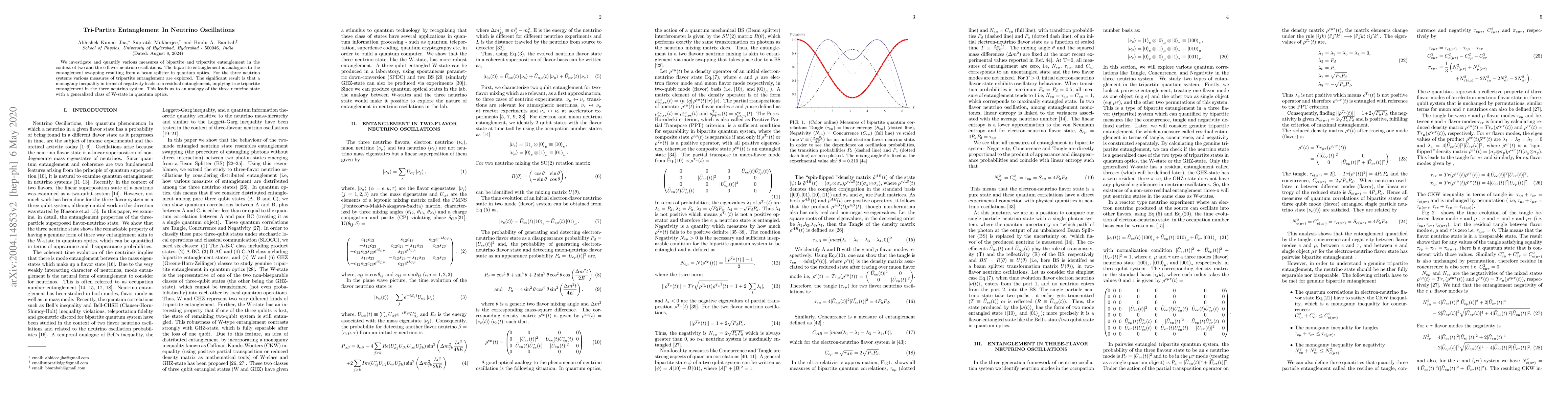 We investigate and quantify various measures of bipartite and tripartite entanglement in the context of two and three flavor neutrino oscillations. The bipartite entanglement is analogous to the entanglement swapping resulting from a beam splitter in quantum optics. For the three neutrino systems various measures of tripartite entanglement are explored. The significant result is that a monogamy inequality in terms of negativity leads to a residual entanglement, implying true tripartite entanglement in the three neutrino system. This leads us to an analogy of the three neutrino state with a generalized class of W-state in quantum optics.
