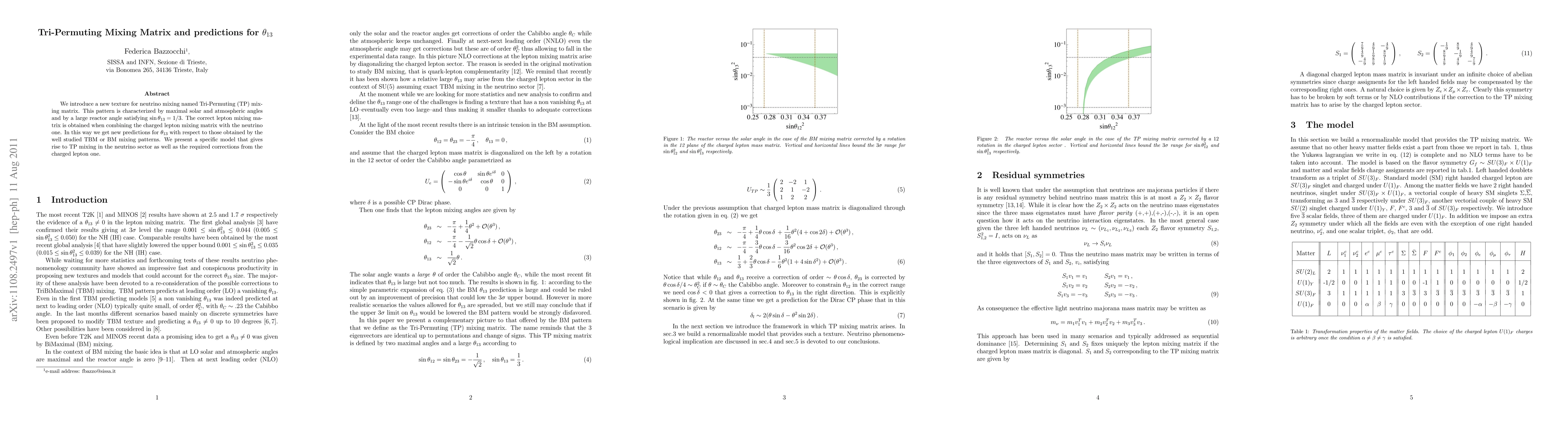 Researchers introduce a new neutrino mixing pattern called Tri-Permuting (TP), which predicts theta_13 values different from those of the well-studied TBM or BM patterns. A specific model is presented to generate TP mixing in the neutrino sector, offering new predictions for theta_13.