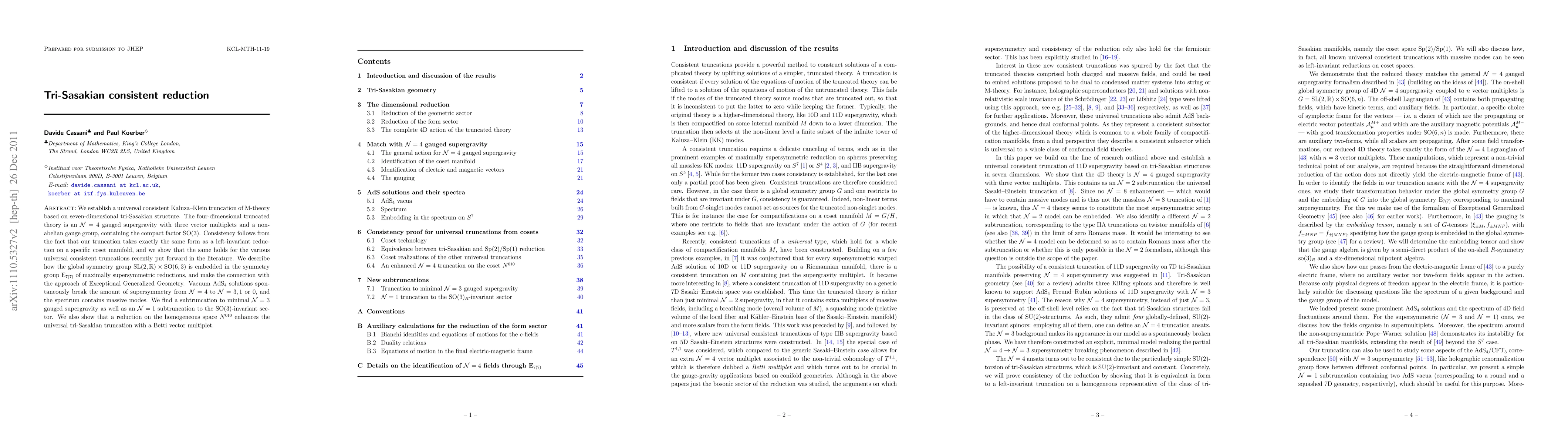 This paper establishes a consistent Kaluza-Klein truncation of M-theory based on a seven-dimensional tri-Sasakian structure, resulting in a four-dimensional N=4 gauged supergravity. It demonstrates the embedding of the global symmetry group SL(2,R) x SO(6,3) within E7(7) and connects this to Exceptional Generalized Geometry, revealing vacuum AdS4 solutions and various subtruncations.