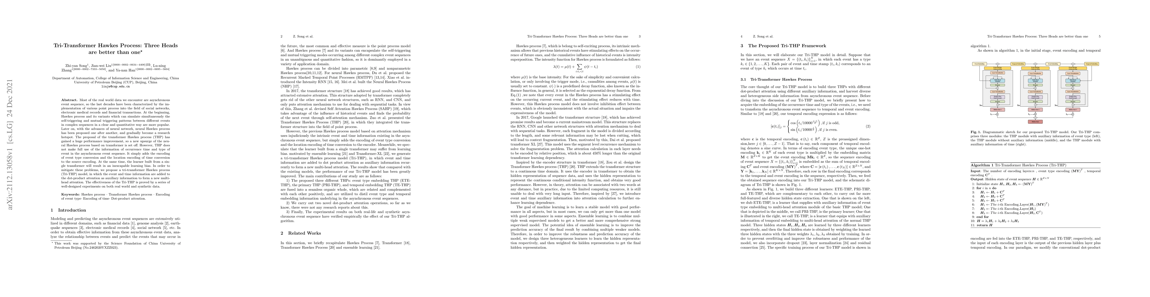 Abstract. Most of the real world data we encounter are asynchronous event sequence, so the last decades have been characterized by the implementation of various point process into the field of social networks,electronic medical records and financial transactions. At the beginning, Hawkes process and its variants which can simulate simultaneously the self-triggering and mutual triggering patterns between different events in complex sequences in a clear and quantitative way are more popular.Later on, with the advances of neural network, neural Hawkes process has been proposed one after another, and gradually become a research hotspot. The proposal of the transformer Hawkes process (THP) has gained a huge performance improvement, so a new upsurge of the neural Hawkes process based on transformer is set off. However, THP does not make full use of the information of occurrence time and type of event in the asynchronous event sequence. It simply adds the encoding of event type conversion and the location encoding of time conversion to the source encoding. At the same time, the learner built from a single transformer will result in an inescapable learning bias. In order to mitigate these problems, we propose a tri-transformer Hawkes process (Tri-THP) model, in which the event and time information are added to the dot-product attention as auxiliary information to form a new multihead attention. The effectiveness of the Tri-THP is proved by a series of well-designed experiments on both real world and synthetic data.