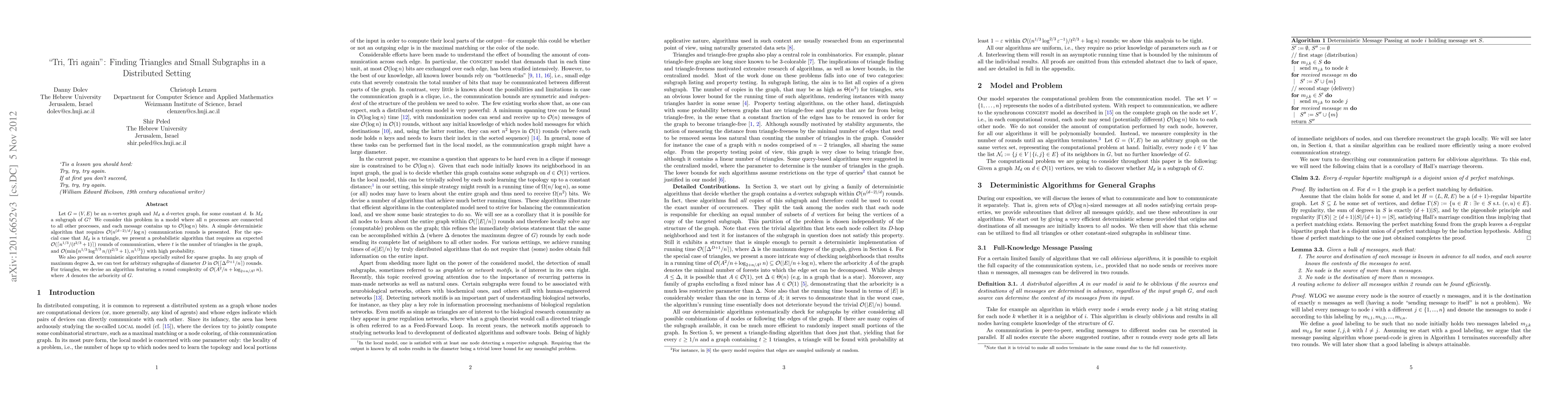 This paper explores efficient algorithms for detecting subgraphs, particularly triangles, in distributed settings. It presents a deterministic algorithm for general subgraph detection and a probabilistic one for triangles, both optimized for communication rounds. Special algorithms for sparse graphs and those considering the arboricity of the graph are also discussed.