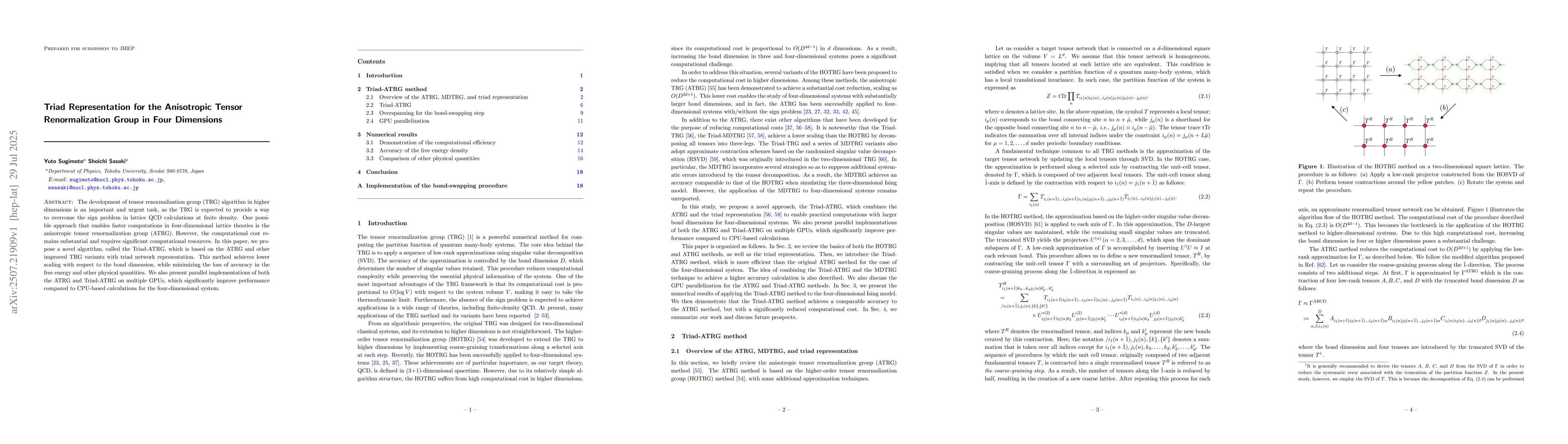 The development of tensor renormalization group (TRG) algorithm in higher dimensions is an important and urgent task, as the TRG is expected to provide a way to overcome the sign problem in lattice QCD calculations at finite density. One possible approach that enables faster computations in four-dimensional lattice theories is the anisotropic tensor renormalization group (ATRG). However, the computational cost remains substantial and requires significant computational resources. In this paper, we propose a novel algorithm, called the Triad-ATRG, which is based on the ATRG and other improved TRG variants with triad network representation. This method achieves lower scaling with respect to the bond dimension, while minimizing the loss of accuracy in the free energy and other physical quantities. We also present parallel implementations of both the ATRG and Triad-ATRG on multiple GPUs, which significantly improve performance compared to CPU-based calculations for the four-dimensional system.