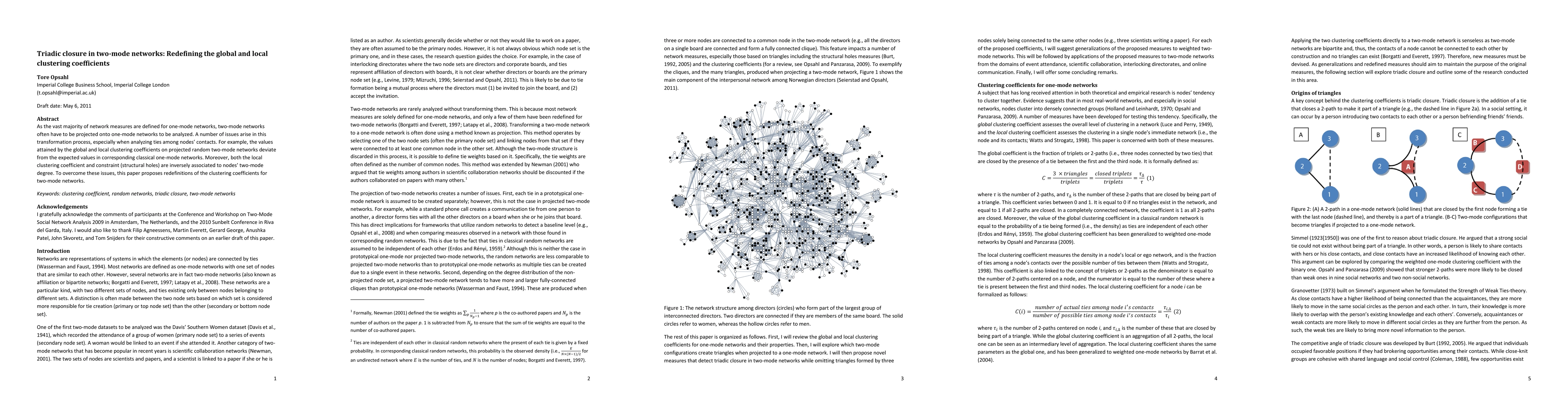 This paper proposes redefinitions for global and local clustering coefficients in two-mode networks to address discrepancies arising from projection onto one-mode networks, aiming to accurately reflect tie formations among nodes' contacts.