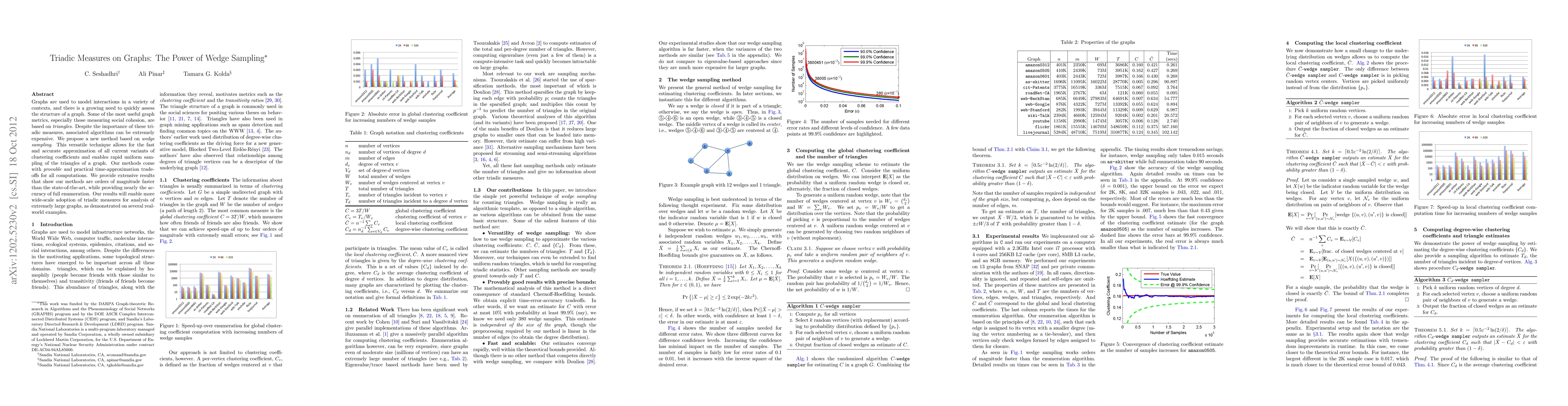 This paper introduces wedge sampling for efficiently approximating triadic measures on graphs, significantly speeding up the computation of clustering coefficients while maintaining near-full enumeration accuracy. The proposed method enables rapid uniform sampling of triangles, offering practical time-approximation tradeoffs and outperforming existing algorithms by orders of magnitude.
