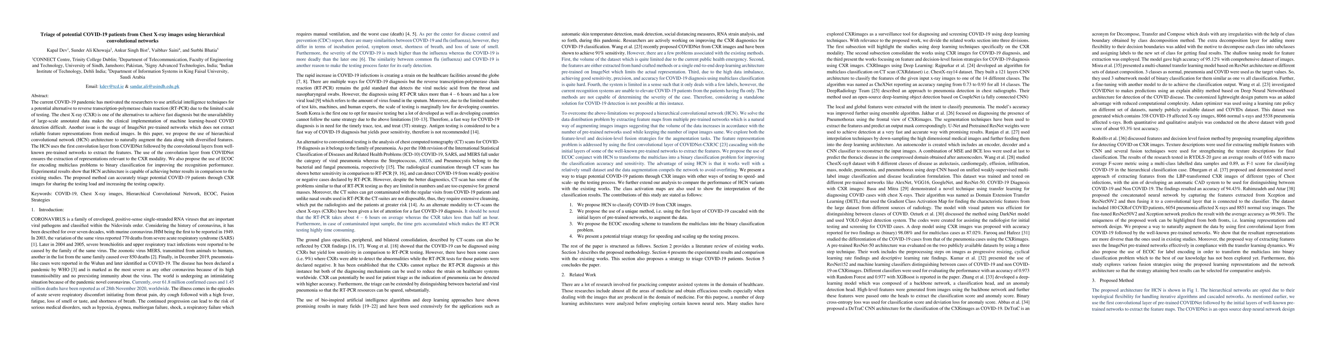 The current COVID-19 pandemic has motivated the researchers to use artificial intelligence techniques for a potential alternative to reverse transcription-polymerase chain reaction (RT-PCR) due to the limited scale of testing. The chest X-ray (CXR) is one of the alternatives to achieve fast diagnosis but the unavailability of large-scale annotated data makes the clinical implementation of machine learning-based COVID detection difficult. Another issue is the usage of ImageNet pre-trained networks which does not extract reliable feature representations from medical images. In this paper, we propose the use of hierarchical convolutional network (HCN) architecture to naturally augment the data along with diversified features. The HCN uses the first convolution layer from COVIDNet followed by the convolutional layers from well-known pre-trained networks to extract the features. The use of the convolution layer from COVIDNet ensures the extraction of representations relevant to the CXR modality. We also propose the use of ECOC for encoding multiclass problems to binary classification for improving the recognition performance. Experimental results show that HCN architecture is capable of achieving better results in comparison to the existing studies. The proposed method can accurately triage potential COVID-19 patients through CXR images for sharing the testing load and increasing the testing capacity.
