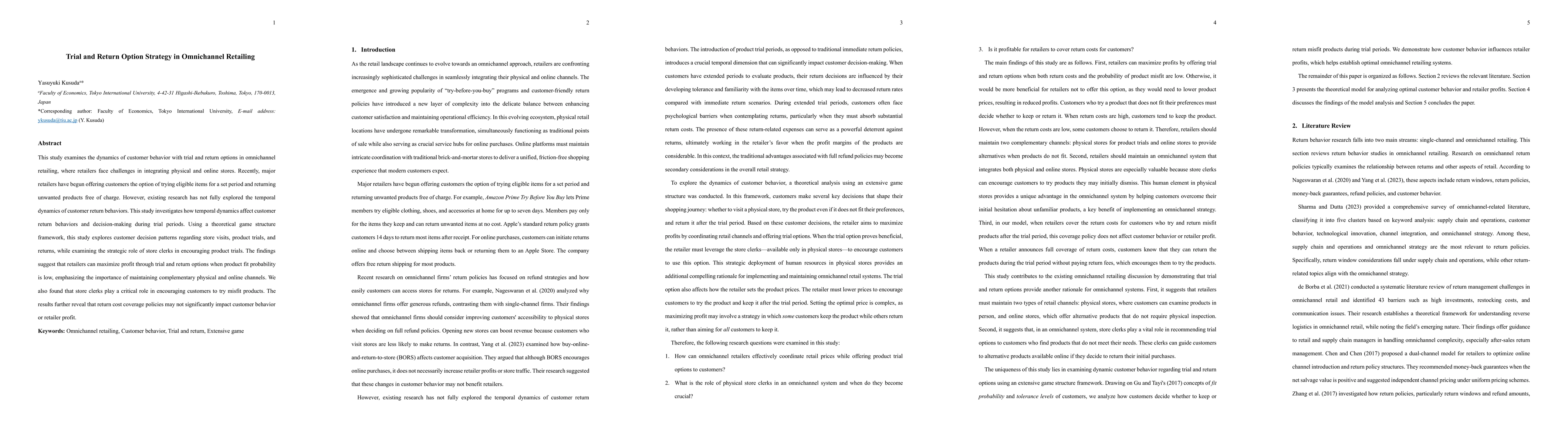 This study analyzes customer behavior in omnichannel retailing with trial and return options, finding that retailers can optimize profit with low product fit probability and emphasizing the role of store clerks in encouraging product trials. The research indicates that return cost coverage policies have minimal impact on customer behavior and retailer profit.