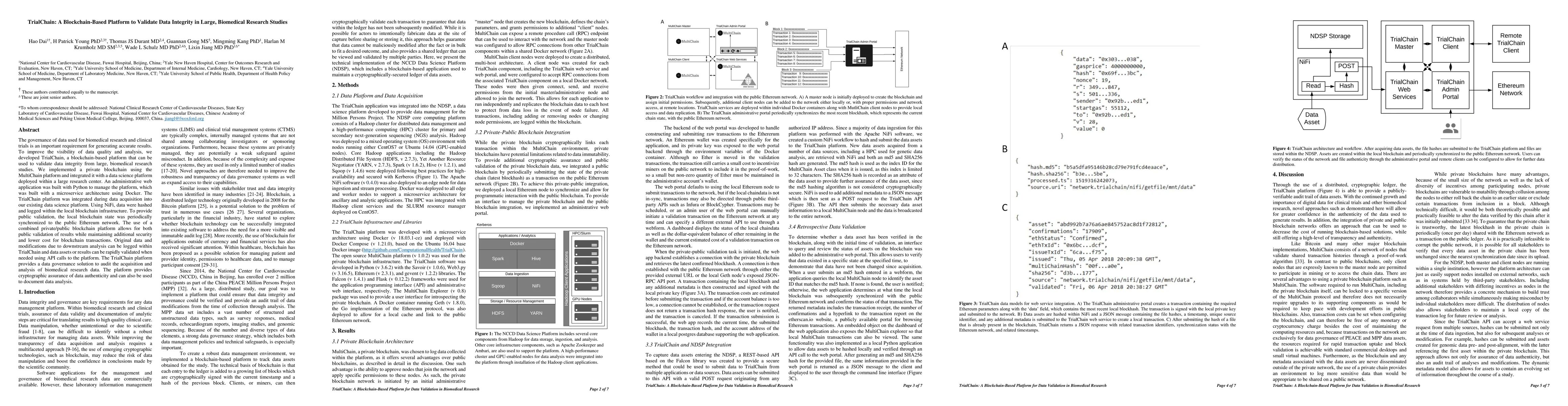 TrialChain is a blockchain-based platform designed to validate data integrity in large biomedical research studies, employing a private blockchain integrated with a data science platform for enhanced data governance and analysis. It uses a combination of private and public blockchains to ensure both security and public validation of research data.