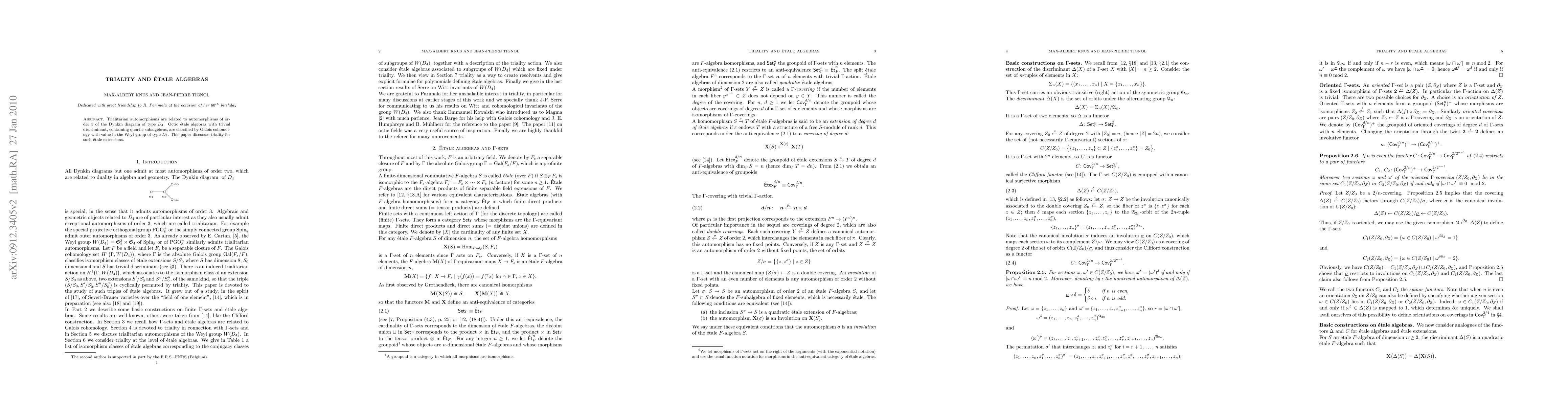 This paper explores the relationship between trialitarian automorphisms and the classification of octic étale algebras with trivial discriminant, focusing on their quartic subalgebras and their connection to the Galois cohomology of the Weyl group of type D4.
