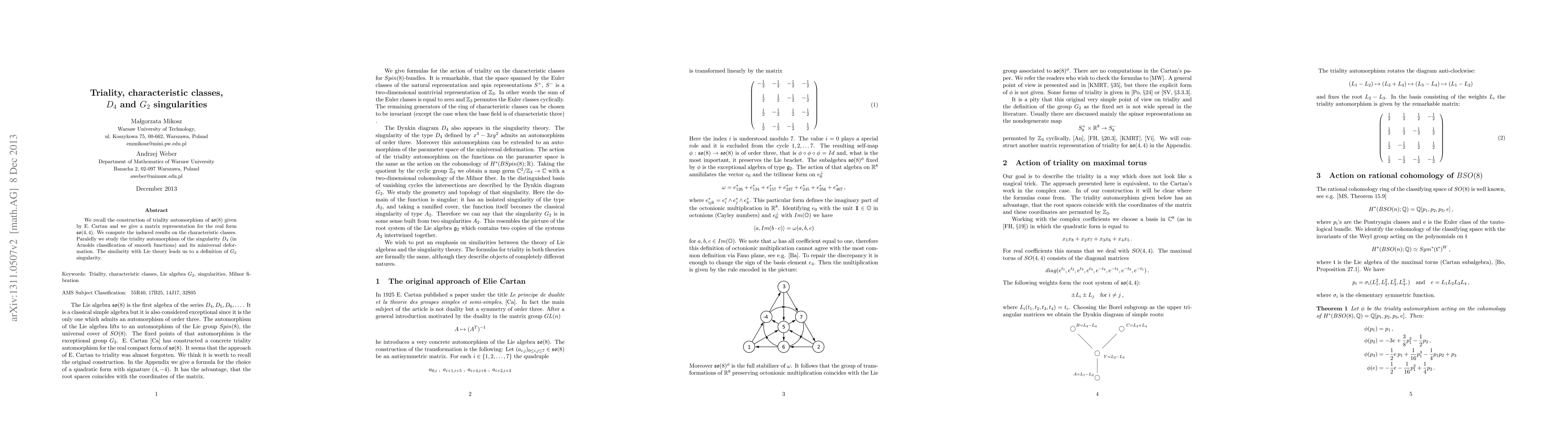 We recall the construction of triality automorphism of so(8) given by E. Cartan and we give a matrix representation for the real form so(4,4). We compute the induced results on the characteristic classes. Paralelly we study the triality automorphism of the singularity D4 (in Arnolds classification of smooth functions) and its miniversal deformation. The similarity with Lie theory leads us to a definition of G2 singularity.