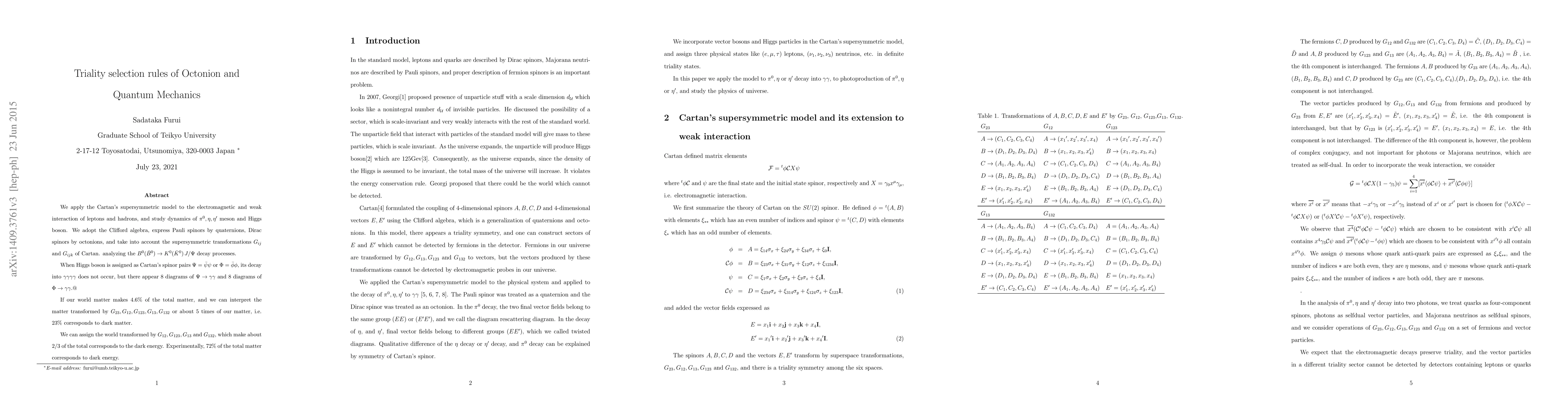 We apply the Cartan's supersymmetric model to the electromagnetic and weak interaction of leptons and hadrons, and study dynamics of $\pi^0,\eta,\eta'$ meson and Higgs boson. We adopt the Clifford algebra, express Pauli spinors by quaternions, Dirac spinors by octonions, and take into account the supersymmetric transformations $G_{ij}$ and $G_{ijk}$ of Cartan. When Higgs boson is assigned as Cartan's spinor pairs $\Psi=\bar\psi\psi$ or $\Phi=\bar\phi\phi$, its decay into $\gamma\gamma\gamma\gamma$ does not occur, but there appear 8 diagrams of $\Psi\to\gamma\gamma$ and 8 diagrams of $\Phi\to\gamma\gamma$. If our world matter makes 4.6\% of the total matter, and we can interpret the matter transformed by $G_{23},G_{12},G_{123},G_{13}, G_{132}$ or about 5 times of our matter, i.e. 23\% corresponds to dark matter. We can assign the world transformed by $G_{12}, G_{123}, G_{13}$ and $G_{132}$, which make about 2/3 of the total corresponds to the dark energy. Experimentally, 72\% of the total matter corresponds to dark energy.