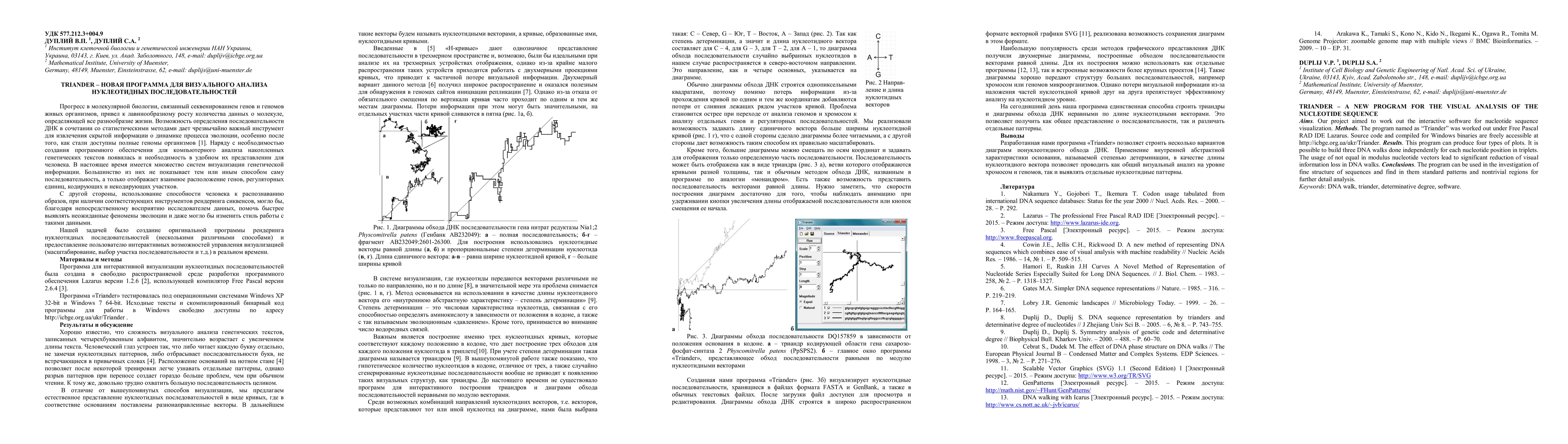 The Triander program is an interactive software package for nucleotide sequence visualization. The program was developed using the freeware Pascal RAD IDE Lazarus, and its source code and binaries compiled for Windows are freely accessible at http://www.icbge.org.ua/eng/Triander . Triander can produce four types of plots. It is possible to build three DNA walks independently for each nucleotide position in triplets. The use of nucleotide vectors with unequal modulus leads to a significant reduction in the visual information lost in DNA walks. The program can be used in the investigation of the fine structure of sequences, to find standard patterns in them and to locate nontrivial regions for further detailed analysis.
