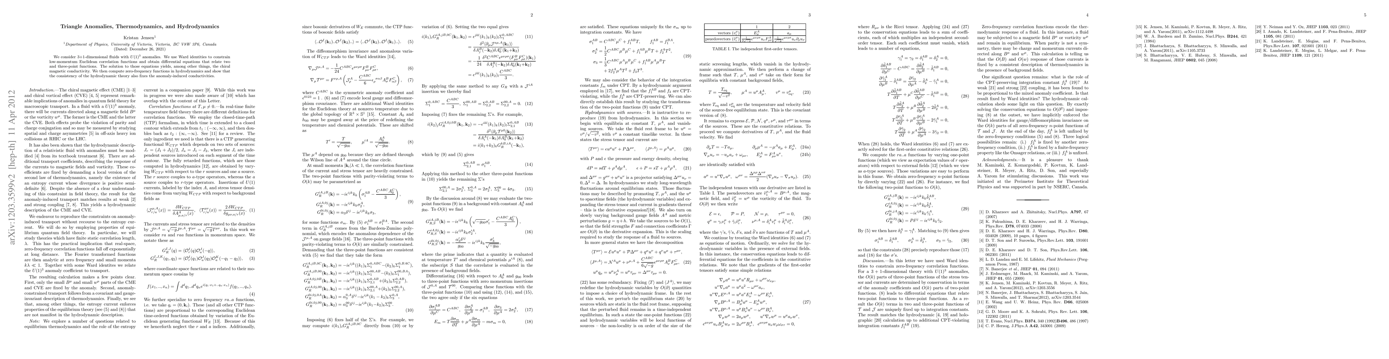 This paper investigates 3+1-dimensional fluids with U(1)^3 anomalies, using Ward identities to derive equations linking correlation functions and determining the chiral magnetic conductivity. It also demonstrates that hydrodynamic theory consistency determines anomaly-induced conductivities at zero frequency.
