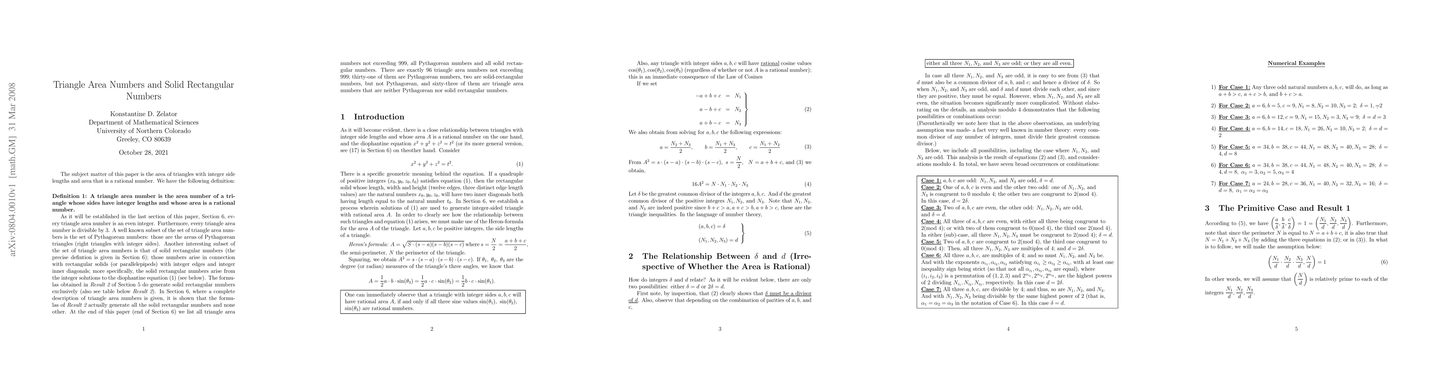 In this work, we define a triangle area number to be the area number of a triangle whose sides have integer lengths, and whose area is a rational number. In Result 3, on page 17, we prove that every triangle area number is in fact an integer which is a multiple of 6. Certain divisibility and other conditions and formulas are also derived, which the three integer sidelengths must satisfy. On pages 20 and 21, we list all the triangle area numbers not exceeding 999.