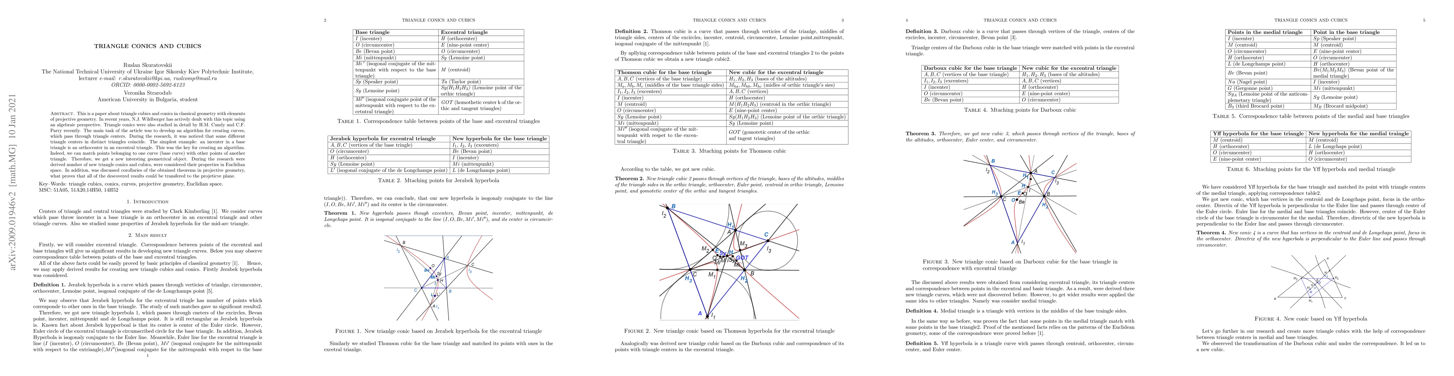 This is a paper about triangle cubics and conics in classical geometry with elements of projective geometry. In recent years, N.J. Wildberger has actively dealt with this topic using an algebraic perspective. Triangle conics were also studied in detail by H.M. Cundy and C.F. Parry recently. The main task of the article was to develop an algorithm for creating curves, which pass through triangle centers. During the research, it was noticed that some different triangle centers in distinct triangles coincide. The simplest example: an incenter in a base triangle is an orthocenter in an excentral triangle. This was the key for creating an algorithm. Indeed, we can match points belonging to one curve (base curve) with other points of another triangle. Therefore, we get a new intersting geometrical object. During the research were derived number of new triangle conics and cubics, were considered their properties in Euclidian space. In addition, was discussed corollaries of the obtained theorems in projective geometry, what proves that all of the descovered results could be transfered to the projeticve plane.