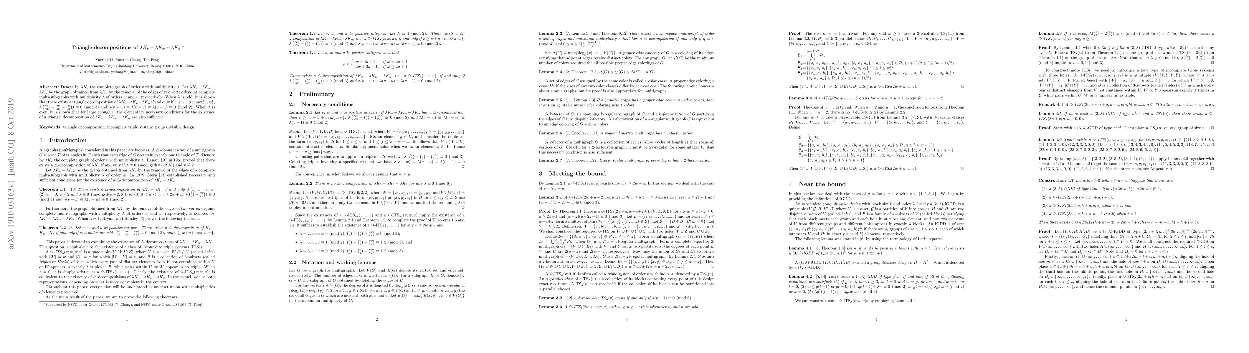 This paper investigates the conditions under which the graph $\lambda K_v-\lambda K_w-\lambda K_u$ can be decomposed into triangles when $\lambda$ is odd or even. For odd $\lambda$, it finds specific conditions on $v$, $w$, and $u$ that guarantee a triangle decomposition. For even $\lambda$, it shows that these conditions are sufficient for large $v$.