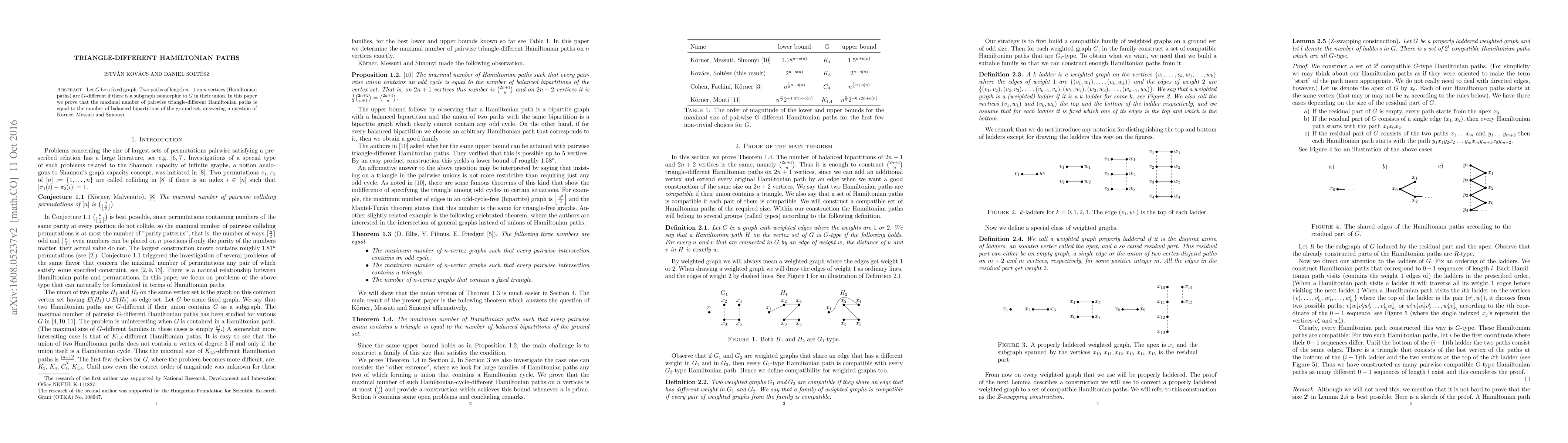 This paper proves that the maximum number of pairwise triangle-different Hamiltonian paths in a graph is equal to the number of balanced bipartitions of its vertex set, resolving a question posed by Körner, Messuti, and Simonyi.