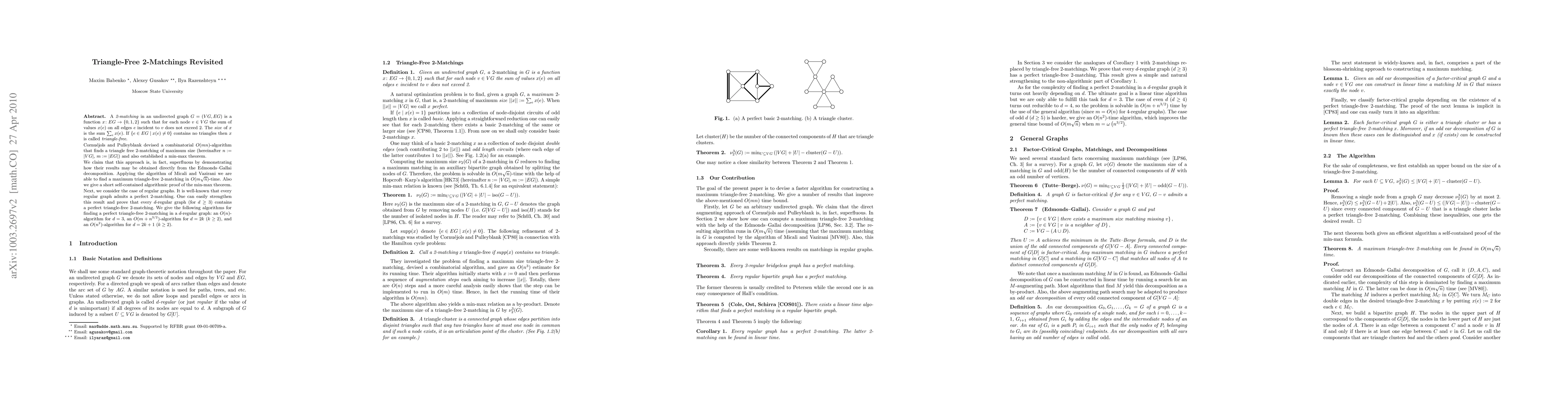 This paper revisits the problem of finding triangle-free 2-matchings in graphs, improving on previous combinatorial algorithms by leveraging the Edmonds--Gallai decomposition and the Micali-Vazirani algorithm to achieve better time complexity. It also presents efficient algorithms for finding perfect triangle-free 2-matchings in regular graphs and proves the existence of a constant factor many such matchings in 3-regular graphs.