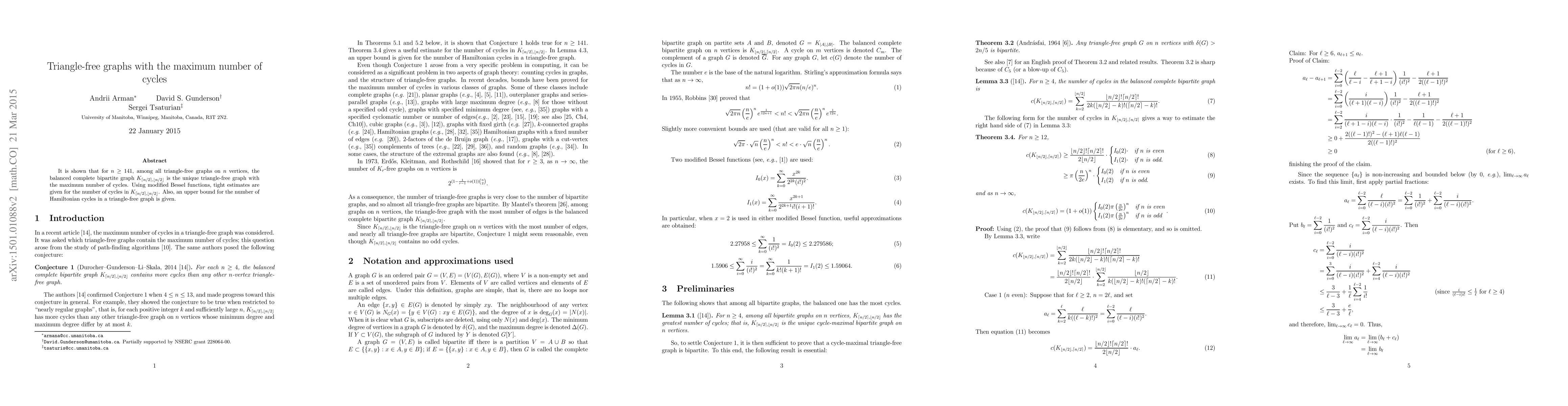Summary: For $n\geq 141$, the complete equibipartite graph is the only triangle-free graph on $n$ vertices that maximizes the number of cycles. This demonstrates a unique structural property among triangle-free graphs.