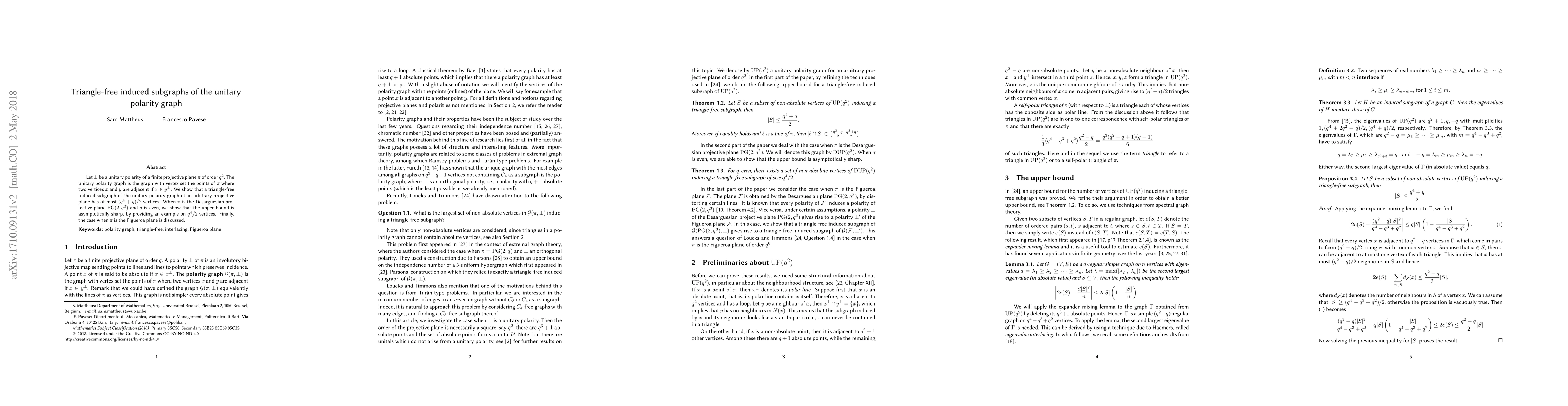 This paper investigates triangle-free induced subgraphs in the unitary polarity graph of a finite projective plane, proving that such subgraphs have at most $(q^4+q)/2$ vertices. For even $q$ and the Desarguesian plane, it demonstrates an asymptotically sharp upper bound with an example. The Figueroa plane's case is also briefly discussed.