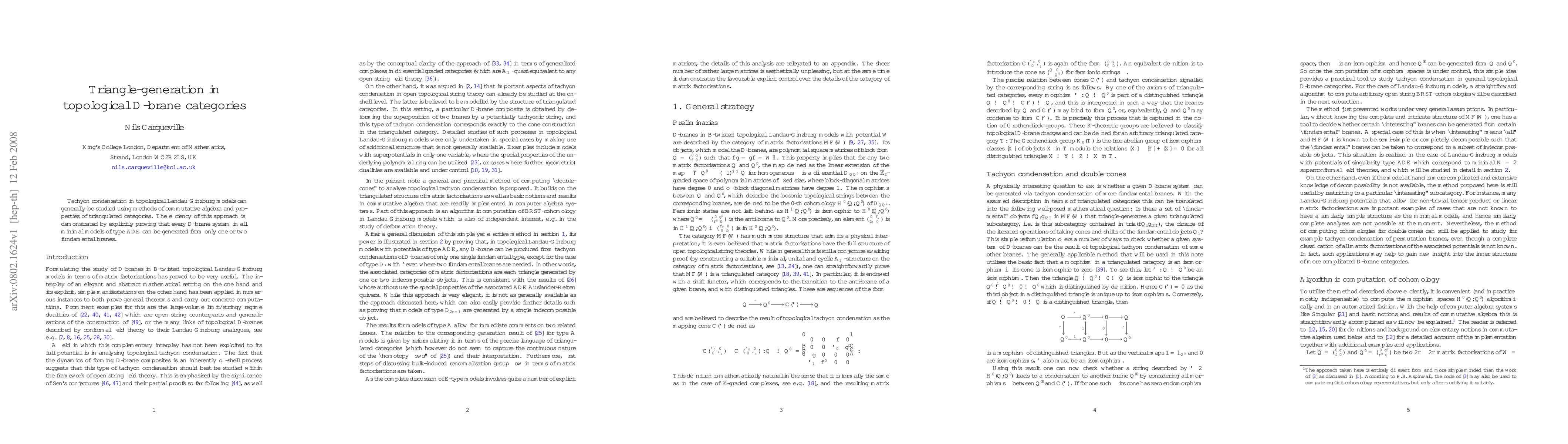 This paper demonstrates that D-brane systems in ADE type minimal models can be generated using just one or two fundamental branes, employing techniques from commutative algebra and triangulated categories. The approach highlights the efficiency of studying tachyon condensation through topological categories.