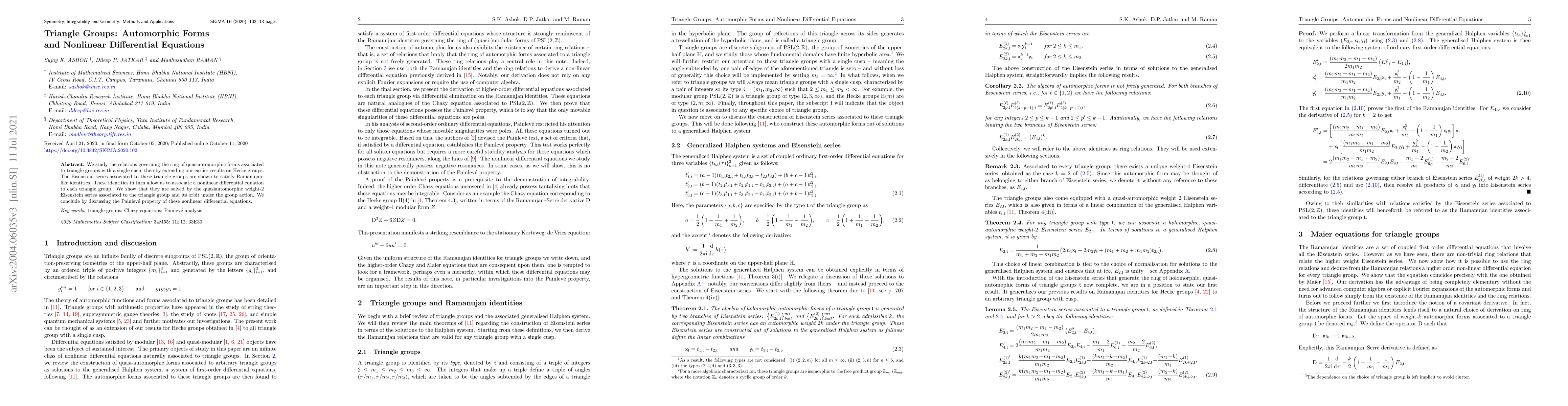 This paper explores the connections between quasiautomorphic forms linked to triangle groups and nonlinear differential equations, demonstrating that the Eisenstein series satisfy Ramanujan-like identities, which in turn define these differential equations. The study concludes by highlighting the Painlevé property of these equations.