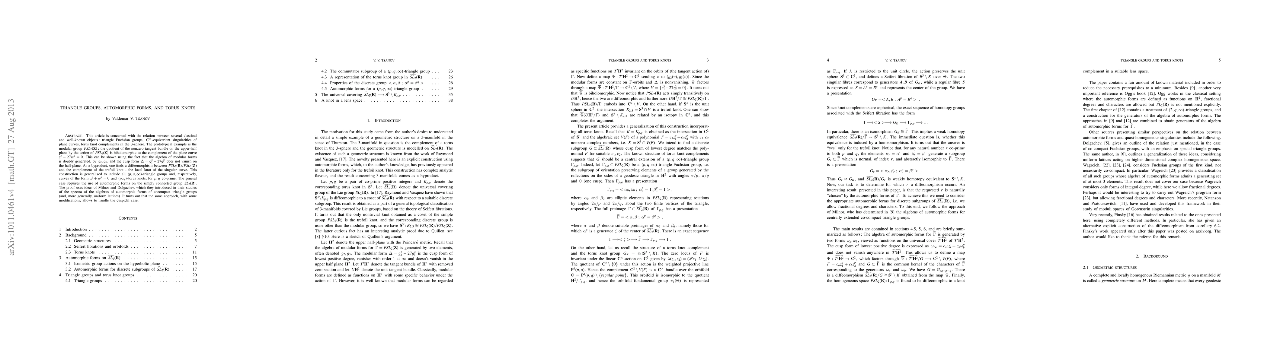 This paper's theme is the relation between several classical and well-known objects: triangle Fuchsian groups, quasi-homogeneous singularities of plane curves, torus knot complements in the 3-sphere. Torus knots are the only nontrivial knots whose complements admit transitive Lie group actions. In fact S^3\K_{p,q} is diffeomorphic to a coset space of the universal covering group of PSL_2(R) with respect to a discrete subgroup G contained in the preimage of a (p,q,\infty)-triangle Fuchsian group. The existence of such a diffeomorphism between is known from a general topological classification of Seifert fibred 3-manifolds. Our goal is to construct an explicit diffeomorphism using automorphic forms. Such a construction is previously known for the trefoil knot K_{2,3} and in fact S^3\K_{2,3} = SL_2(R)/SL_2(Z). The connection between the two sides of the diffeomorphism comes via singularities of plane curves.