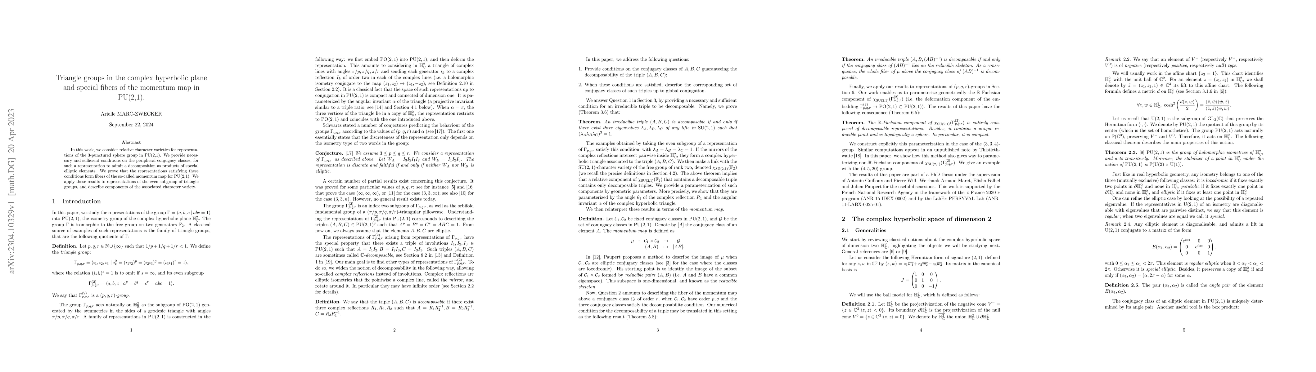 This paper investigates relative character varieties for representations of the 3-punctured sphere group in PU(2,1), establishing conditions for decompositions into special elliptic elements. It demonstrates that these representations form special fibers of the momentum map for PU(2,1) and applies these findings to the even subgroup of triangle groups, detailing components of the associated character variety.