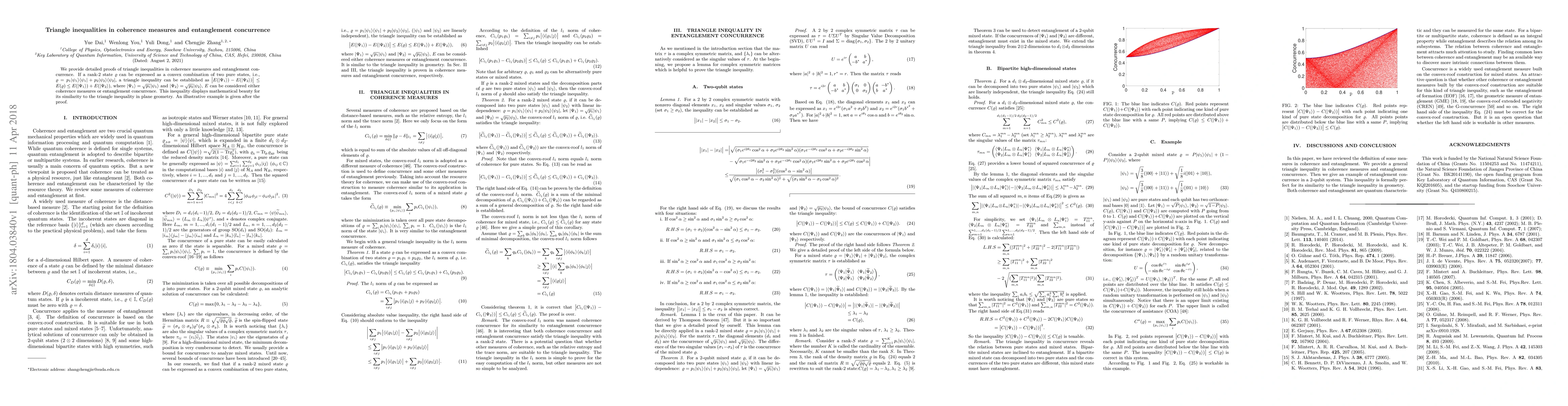 This paper proves triangle inequalities in coherence measures and entanglement concurrence for rank-2 states expressed as convex combinations of pure states. It establishes a relationship analogous to the triangle inequality in geometry, demonstrating the mathematical elegance of these inequalities.