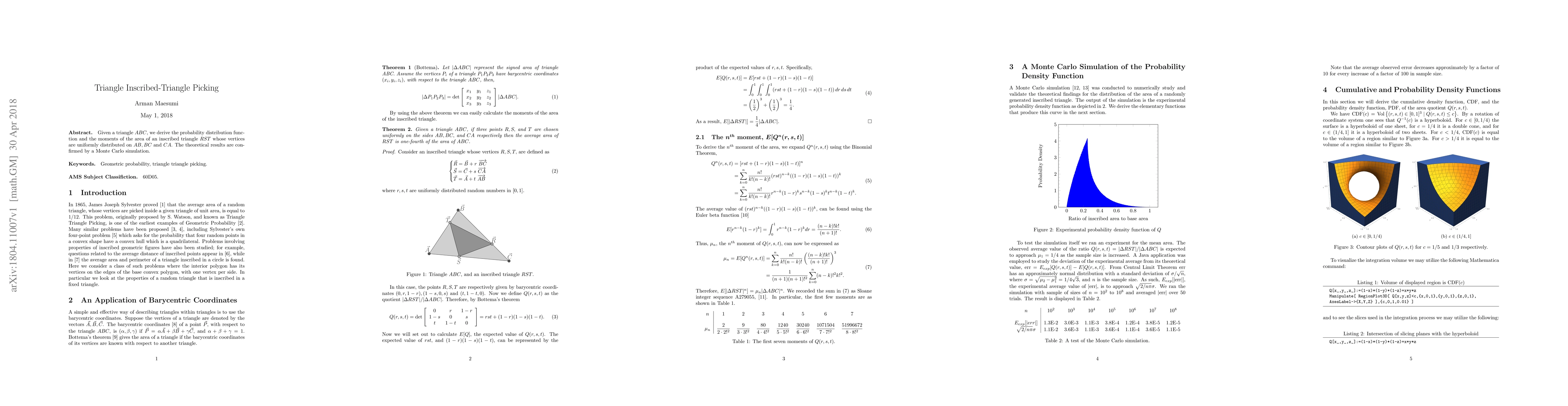 The derivation of the probability distribution function and moments of the area of an inscribed triangle using a combination of theoretical analysis and Monte Carlo simulation.