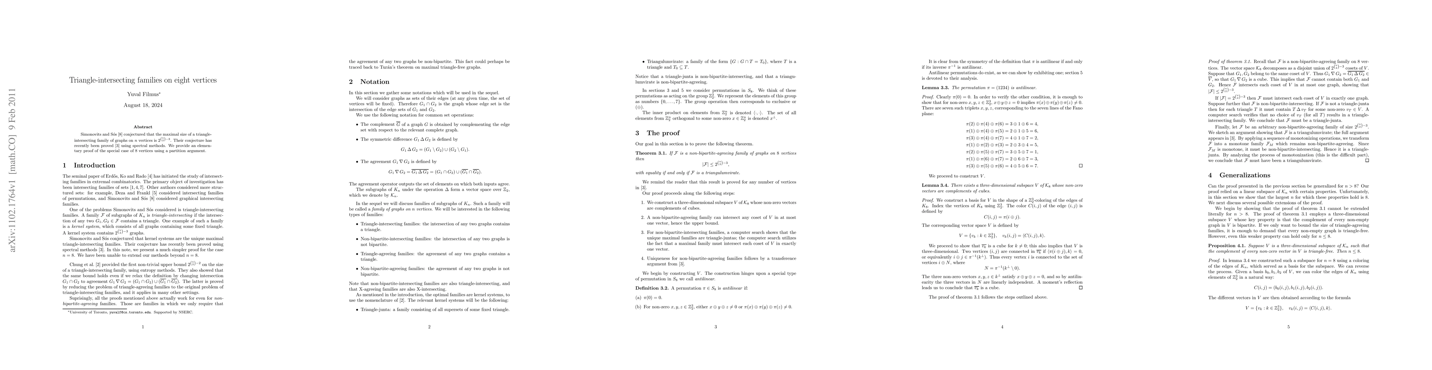 Simonovits and S\'{o}s conjectured that the maximal size of a triangle-intersecting family of graphs on $n$ vertices is $2^{\binom{n}{2}-3}$. Their conjecture has recently been proved using spectral methods. We provide an elementary proof of the special case of $8$ vertices using a partition argument.