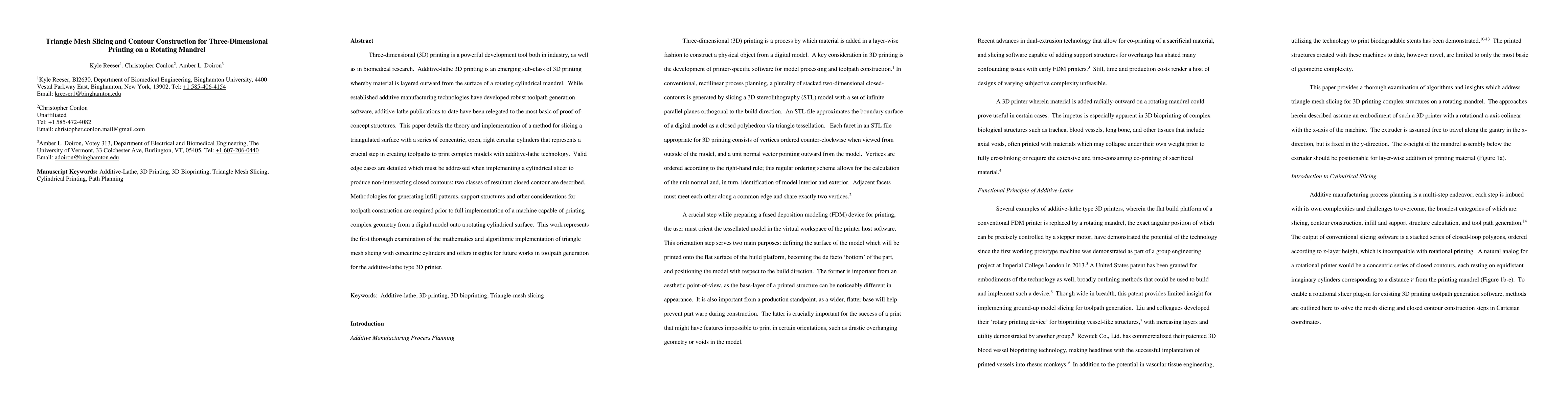 This paper presents a method for slicing triangulated surfaces using concentric cylinders for additive-lathe 3D printing on a rotating mandrel, addressing valid edge cases and describing the resultant closed contours. It lays the groundwork for future toolpath generation for complex geometries in this emerging 3D printing technology.
