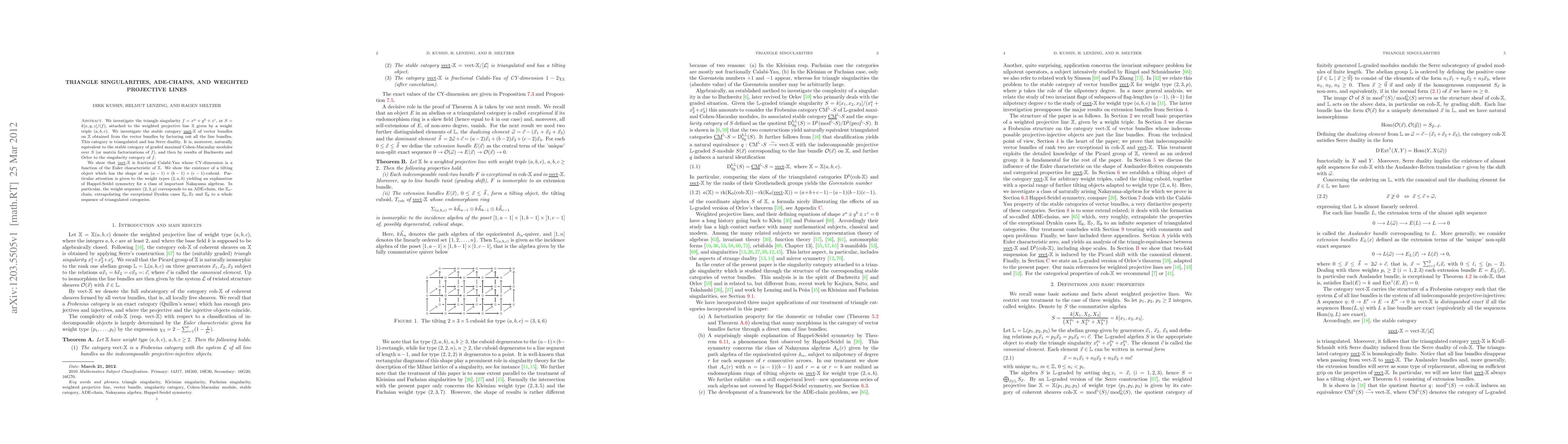 We investigate the triangle singularity $f=x^a+y^b+z^c$, or $S=k[x,y,z]/(f)$, attached to a weighted projective line $X$ given by the weight triple $(a,b,c)$. We investigate the stable category of vector bundles on $X$ obtained from the vector bundles by factoring out all line bundles. This category is triangulated and has Serre duality. It is, moreover, naturally equivalent to the stable category of graded maximal Cohen-Macaulay modules over $S$ (or matrix factorizations of $f$), and then by results of Buchweitz and Orlov to the graded singularity category of $f$. We show that this category is fractional Calabi-Yau with a CY-dimension that is a function of the Euler characteristic of $X$. We show the existence of a tilting object which has the shape of an $(a-1)(b-1)(c-1)$-cuboid. Particular attention is given to the weight types $(2,a,b)$, yielding an explanation of Happel-Seidel symmetry for a class of important Nakayama algebras. In particular, the weight sequence $(2,3,p)$ corresponds to an ADE-chain, the $E_n$-chain, extrapolating the exceptional Dynkin cases $E_6$, $E_7$ and $E_8$ to a whole sequence of triangulated categories.