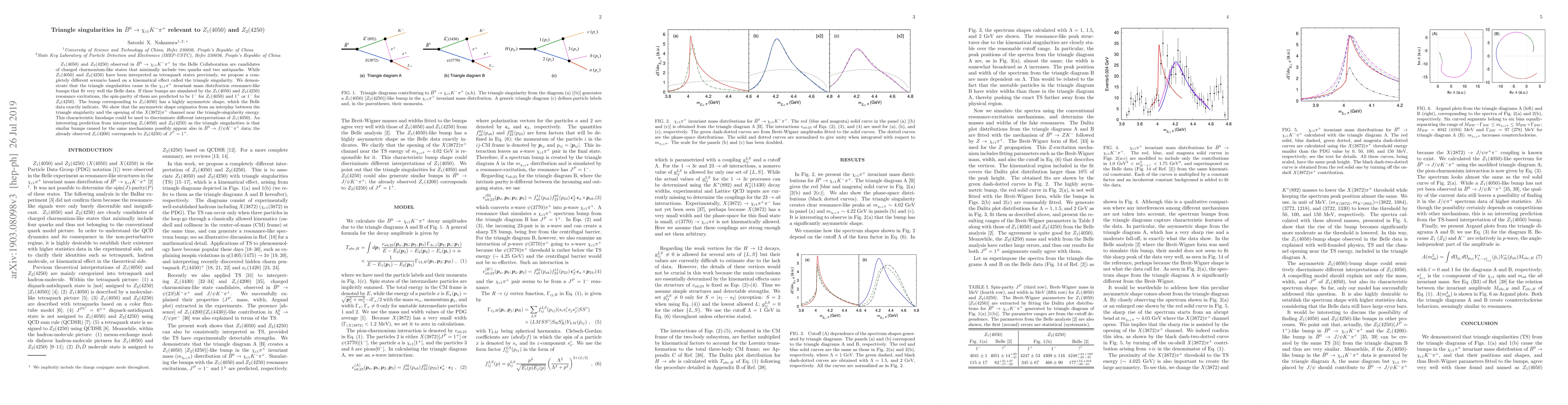 $Z_1(4050)$ and $Z_2(4250)$ observed in $\bar{B}^0\to\chi_{c1}K^-\pi^+$ by the Belle Collaboration are candidates of charged charmonium-like states that minimally includes two quarks and two antiquarks. While $Z_1(4050)$ and $Z_2(4250)$ have been interpreted as tetraquark states previously, we propose a completely different scenario based on a kinematical effect called the triangle singularity. We demonstrate that the triangle singularities cause in the $\chi_{c1}\pi^+$ invariant mass distribution resonance-like bumps that fit very well the Belle data. If these bumps are simulated by the $Z_1(4050)$ and $Z_2(4250)$ resonance excitations, the spin-parity of them are predicted to be $1^-$ for $Z_1(4050)$ and $1^+$ or $1^-$ for $Z_2(4250)$. The bump corresponding to $Z_1(4050)$ has a highly asymmetric shape, which the Belle data exactly indicate. We show that the asymmetric shape originates from an interplay between the triangle singularity and the opening of the $X(3872)\pi^+$ channel near the triangle-singularity energy. This characteristic lineshape could be used to discriminate different interpretations of $Z_1(4050)$. An interesting prediction from interpretting $Z_1(4050)$ and $Z_2(4250)$ as the triangle singularities is that similar bumps caused by the same mechanisms possibly appear also in $\bar{B}^0\to J/\psi K^-\pi^+$ data; the already observed $Z_c(4200)$ corresponds to $Z_2(4250)$ of $J^P=1^+$.