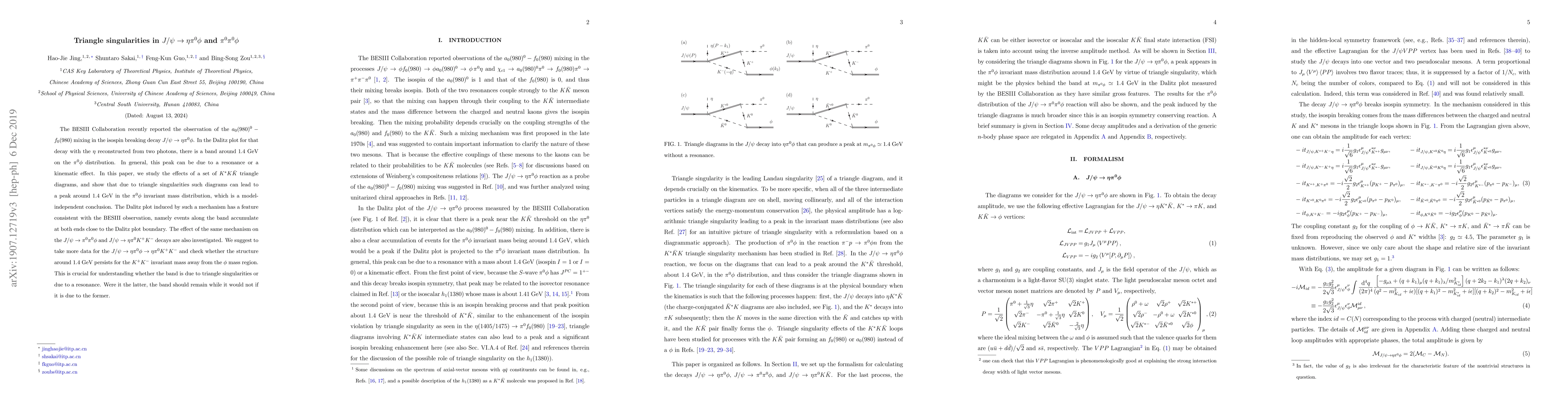 This paper investigates triangle singularities in the decay $J/\psi\to\eta\pi^0\phi$ and finds a peak around 1.4 GeV in the $\pi^0\phi$ distribution, suggesting it may be due to $K^*K\bar K$ triangle diagrams. It also examines the $J/\psi\to\pi^0\pi^0\phi$ and $J/\psi \to \eta\pi^0 K^+K^-$ decays, recommending further data collection to determine if the peak is due to triangle singularities or a resonance.