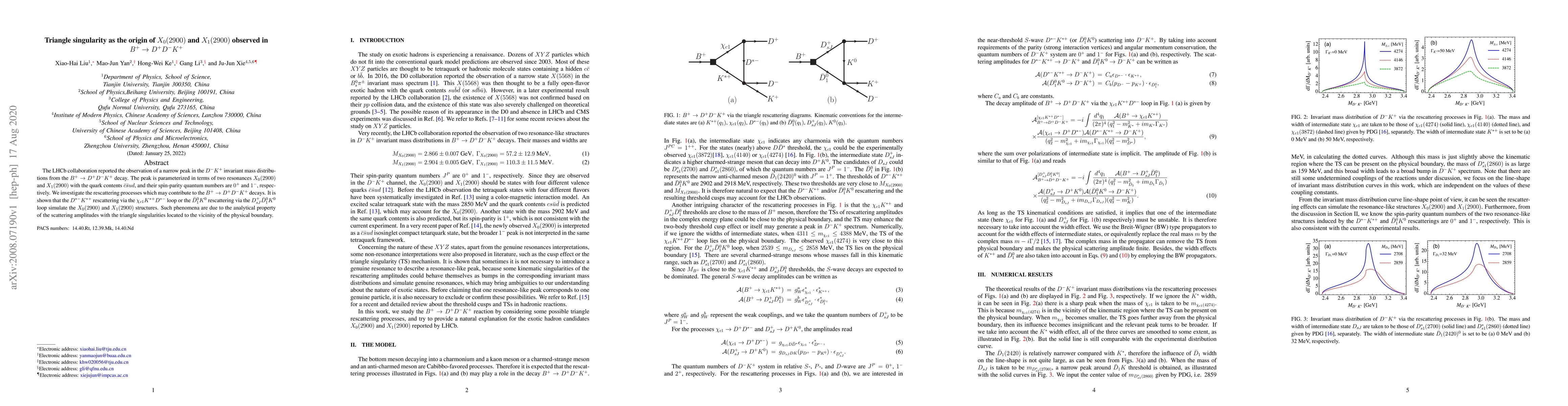 The LHCb collaboration observed resonances $X_0(2900)$ and $X_1(2900)$ in $B^+\to D^+ D^- K^+$ decays. The paper demonstrates that triangle singularities in rescattering processes, such as $D^{*-}K^{*+}$ via $\chi_{c1}$ or $\bar{D}_{1}^{0}K^{0}$ via $D_{sJ}^{+}$, can explain these resonances.