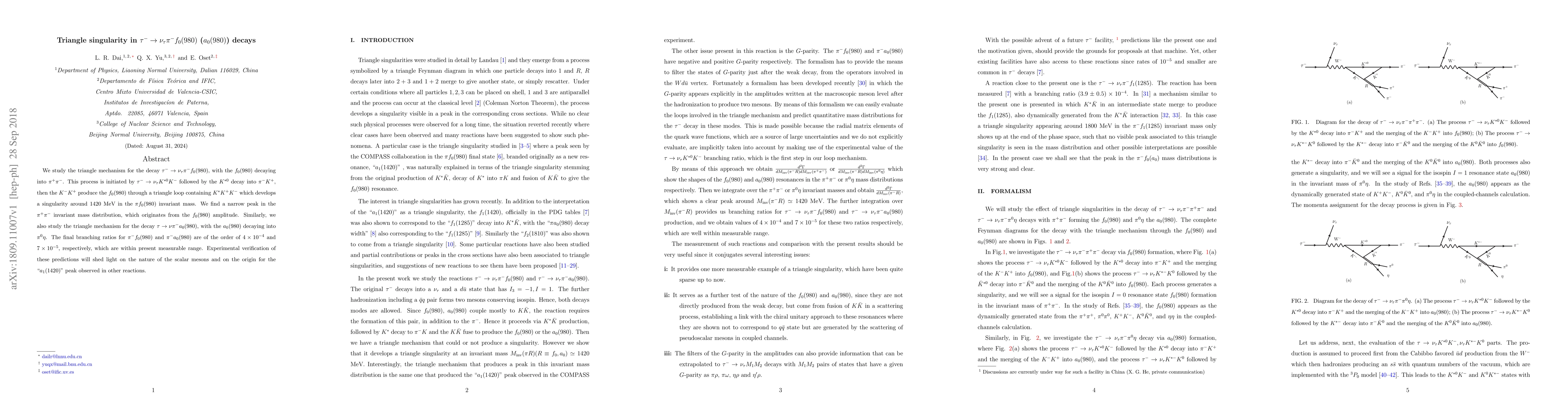 This paper investigates the triangle singularity mechanism in the decay $\tau^- \to \nu_\tau \pi^- f_0(980)$, revealing a peak in the $\pi^+ \pi^-$ invariant mass due to the $f_0(980)$ amplitude. It also explores the analogous decay $\tau \to \nu \pi^- a_0(980)$, predicting branching ratios within measurable ranges and suggesting experimental verification to understand scalar mesons and the "$a_1(1420)$" peak.