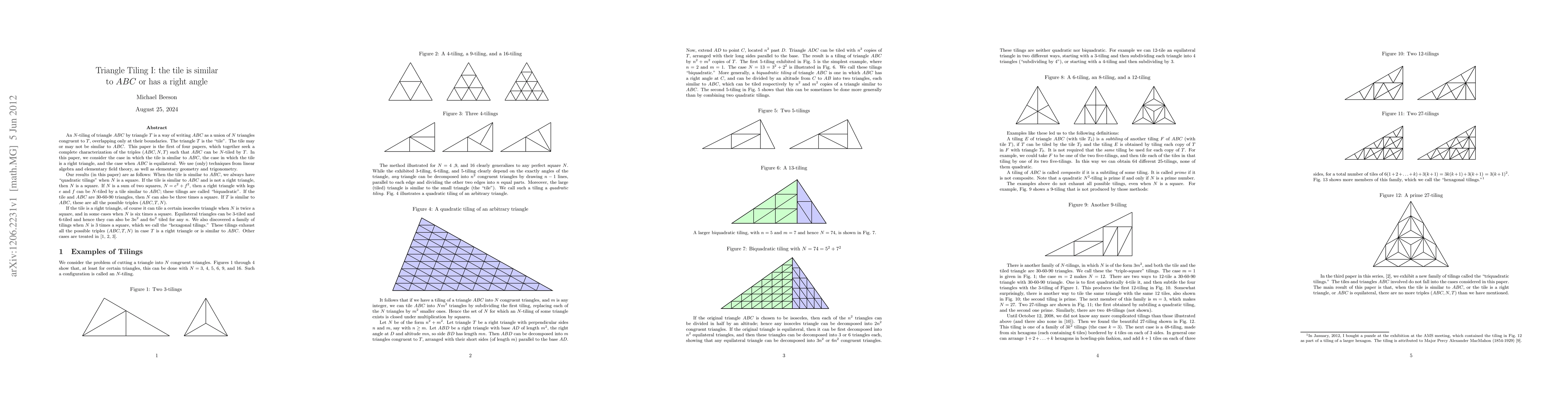 This paper explores triangle tiling configurations where the tile is either similar to triangle ABC or a right triangle, using techniques from linear algebra and geometry. It finds that similar tiles yield "quadratic tilings" when N is a square, while right triangles can tile with N as a sum of two squares or specific multiples. Equilateral triangles can be tiled with 3 or 6 copies, and a family of "hexagonal tilings" is identified for certain N values.